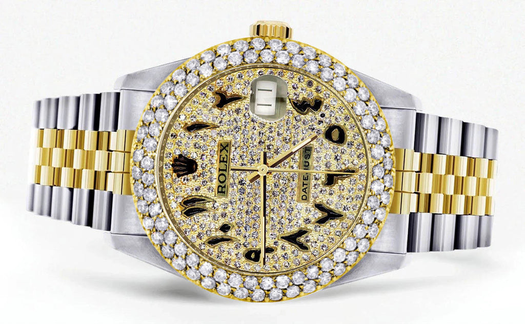 Diamond Gold Rolex Watch For Women 16233 | 36Mm | Black Arabic Full Diamond Dial | Two Row 4.25 Carat Bezel | Jubilee Band