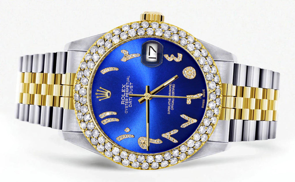 Diamond Gold Rolex Watch For Women 16233 | 36Mm | Blue Arabic Diamond Dial | Two Row 4.25 Carat Bezel | Jubilee Band
