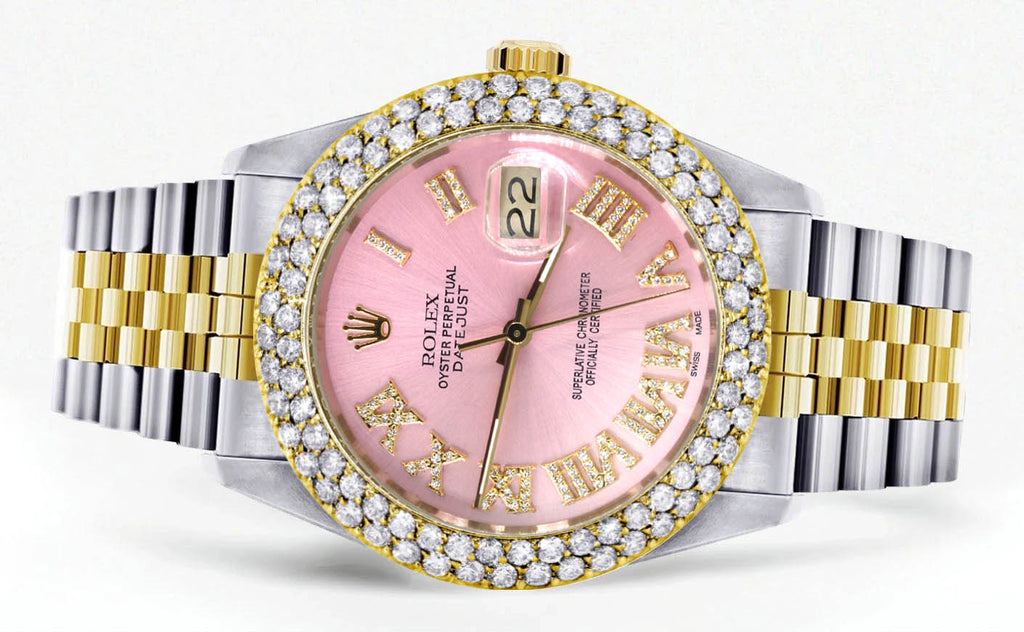 Diamond Gold Rolex Watch For Women 16233 | 36Mm | Pink Roman Numeral Dial | Two Row 4.25 Carat Bezel | Jubilee Band