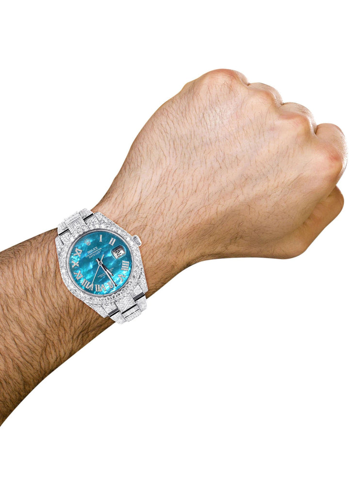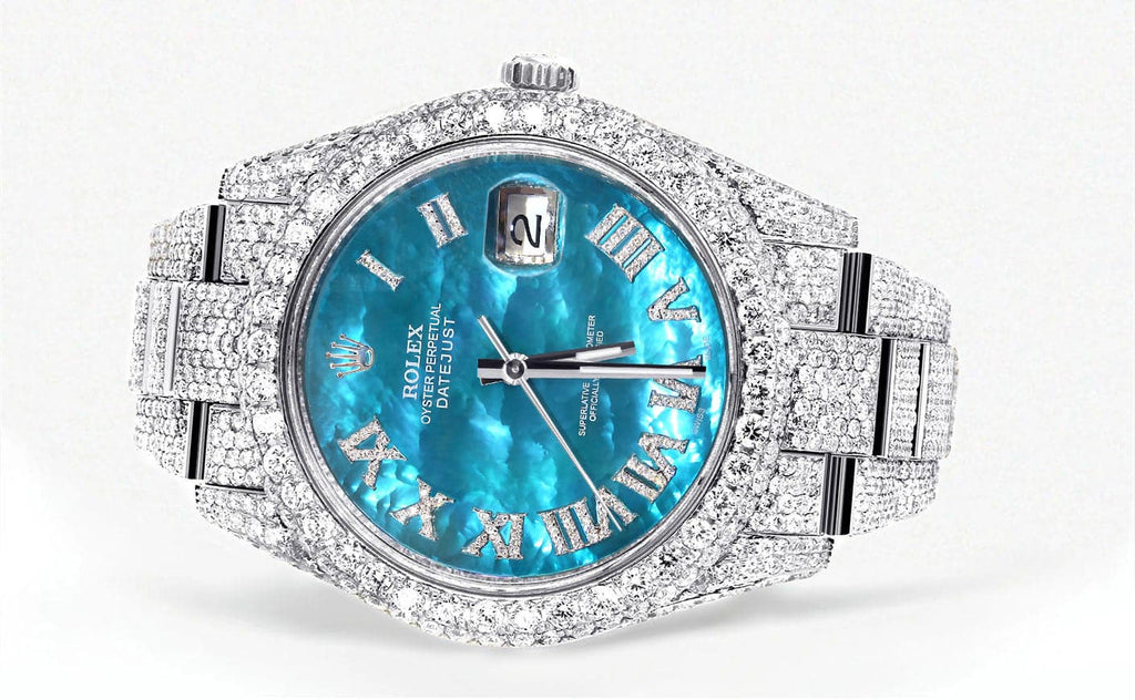 Diamond Iced Out Rolex Datejust 41 | 25 Carats Of Diamonds | Aquamarine Mother of Pearl Dial | Two Row | Oyster Band
