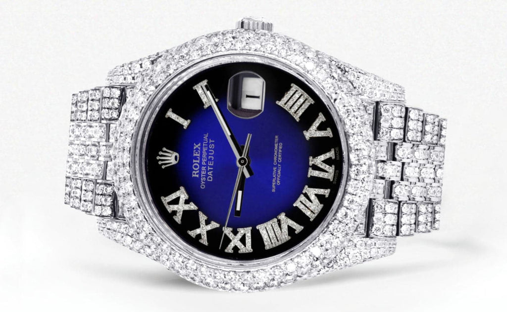 Diamond Iced Out Rolex Datejust 41 | 25 Carats Of Diamonds | Custom Blue Black Roman Numeral Diamond Dial | Two Row | Jubilee Band