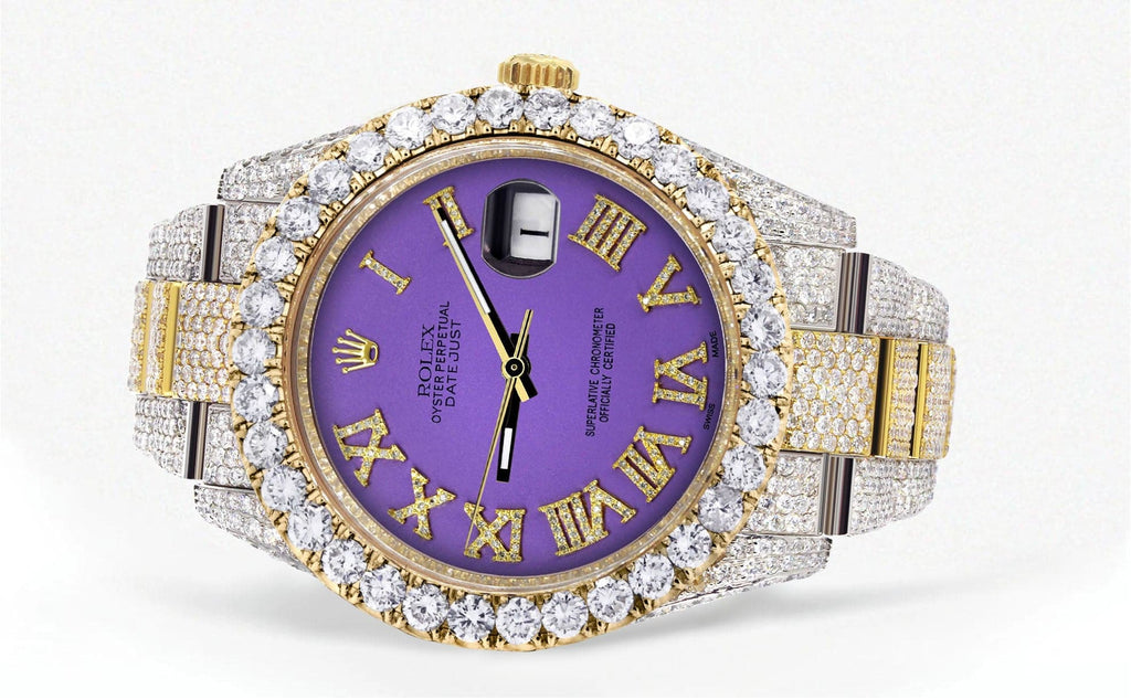 Diamond Iced Out Rolex Datejust 41 | 25 Carats Of Diamonds | Custom Purple Roman Numeral Diamond Dial | Two Tone | Oyster Band
