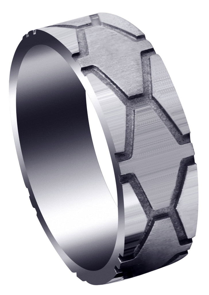 Fancy Carved Contemporary Mens Wedding Band Which Comes In 7 Mm Width,  The Ring Is In High Polish Finish And Can Be Made In Any Metal Of Choice As Selected Above.