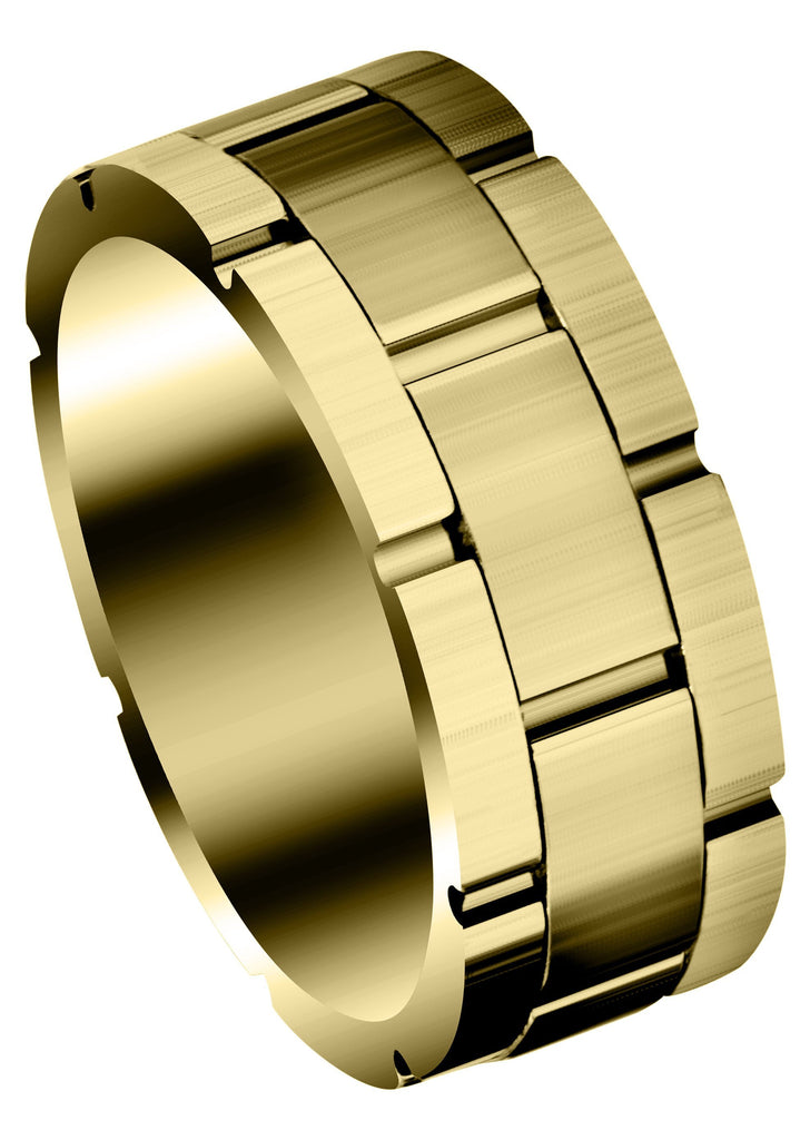 Fancy Carved Contemporary Mens Wedding Band Which Comes In 8.5 Mm Width,  The Ring Is In Satin Finish And Can Be Made In Any Metal Of Choice As Selected Above.