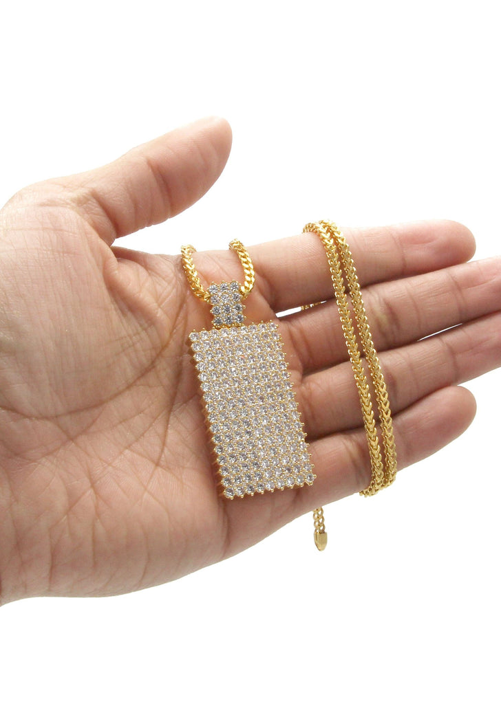 Gold Plated Franco Chain & Dog Tag Pendant Which weighs 28 Grams. The Width Of The Pendant Is 1 Inches And The Length Of The Pendant Is 2.3 Inches. The Width Of The Chain Is 3mm And The Length Can Be Adjusted Above.