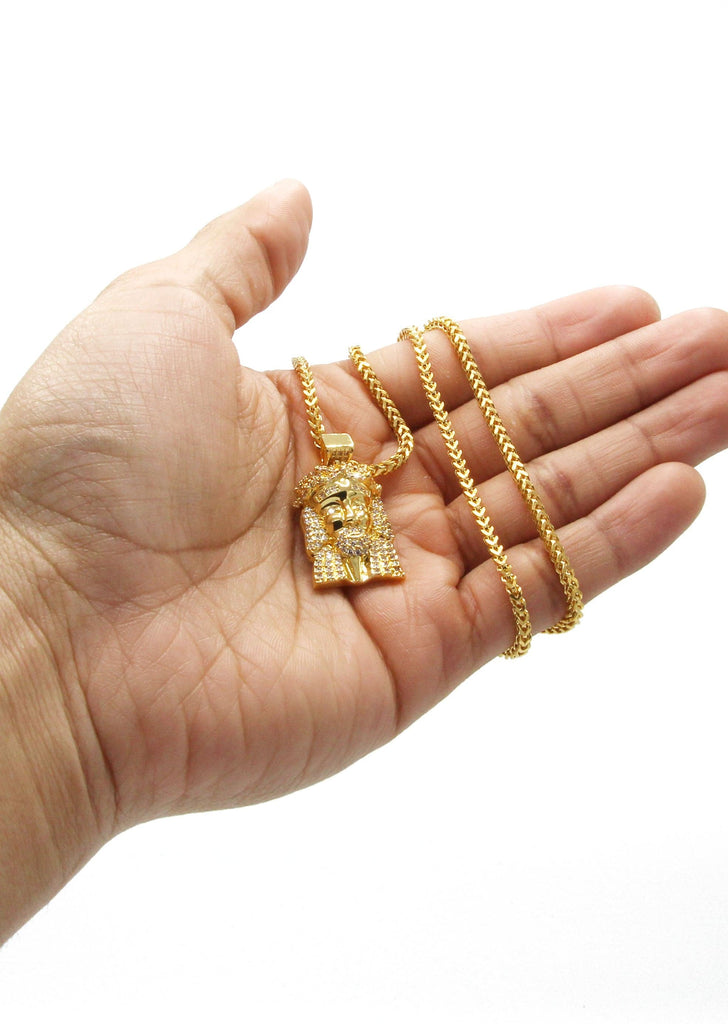 Gold Plated Franco Chain & Jesus Head Pendant Which weighs 15.2 Grams. The Width Of The Pendant Is 0.7 Inches And The Length Of The Pendant Is 1.5 Inches. The Width Of The Chain Is 3mm And The Length Can Be Adjusted Above.