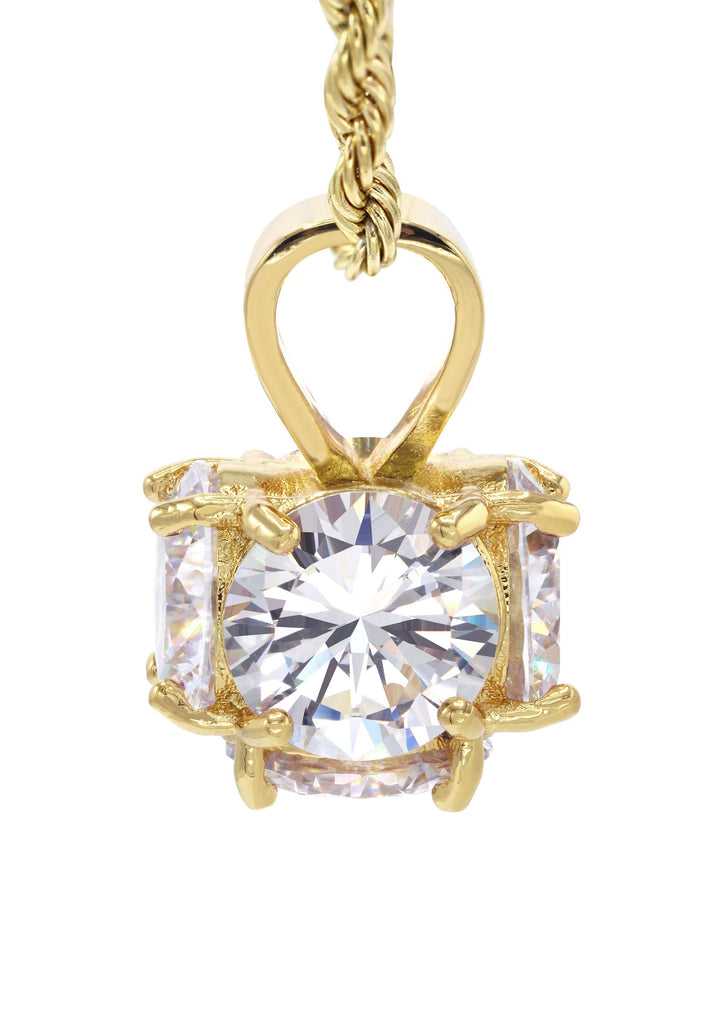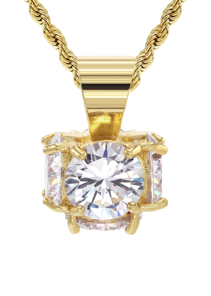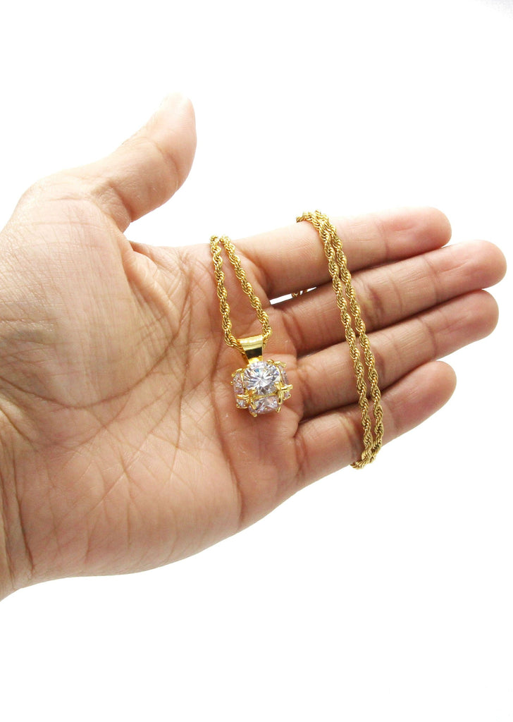 Gold Plated Rope Chain & Cubic Zirconia Pendant Which weighs 19 Grams. The Width Of The Pendant Is 0.6 Inches And The Length Of The Pendant Is 0.9 Inches. The Width Of The Chain Is 3mm And The Length Can Be Adjusted Above.