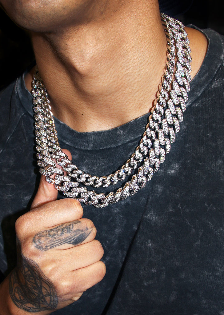 White gold plated and CZ solid miami cuban link chains. Customize your look by selecting your chains. This layered look comes with 2 chains, so select your chain widths and then select the lengths you want.