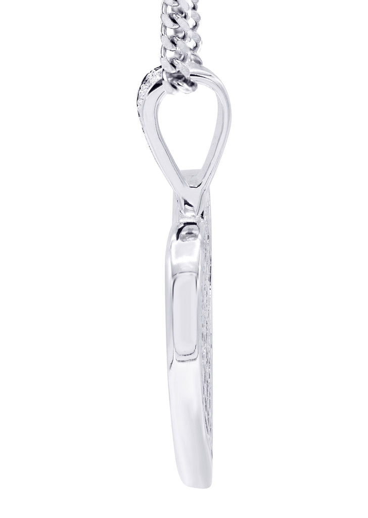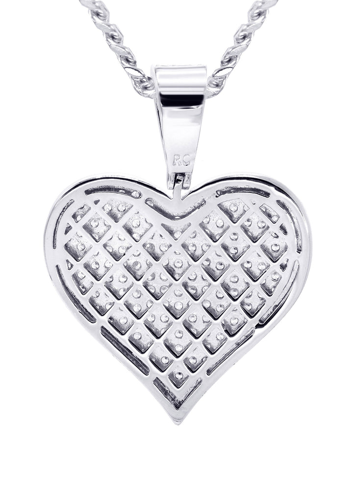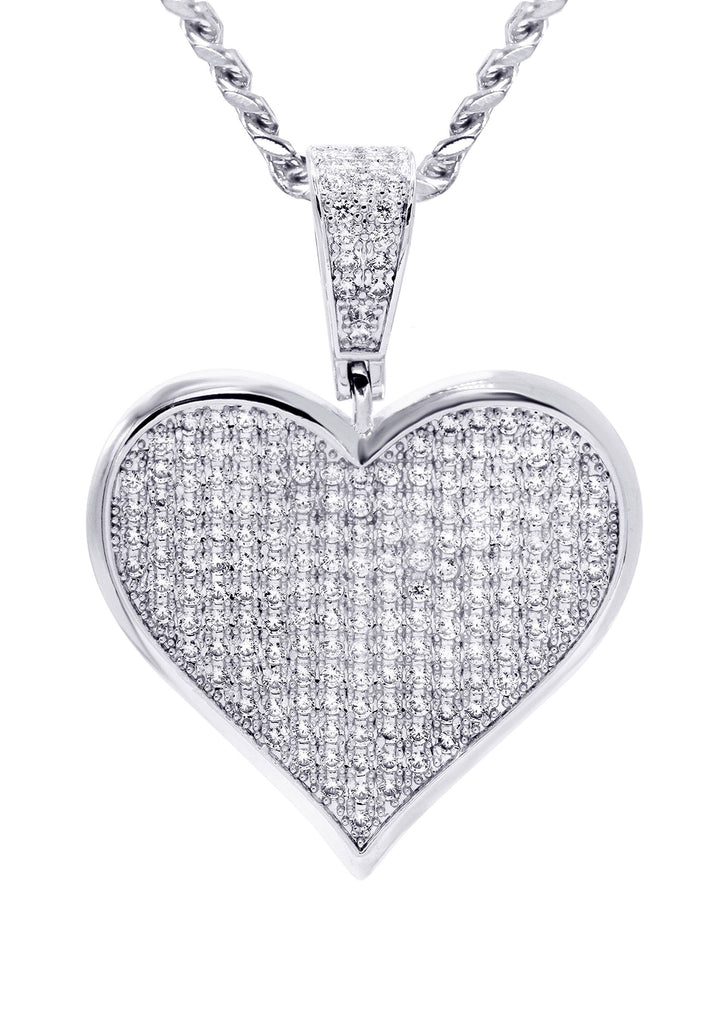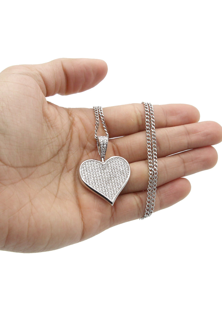 White Gold Plated Cuban Link Chain & Heart Pendant Which weighs 19.5 Grams. The Width Of The Pendant Is 1.3 Inches And The Length Of The Pendant Is 1.8 Inches. The Width Of The Chain Is 3mm And The Length Can Be Adjusted Above.