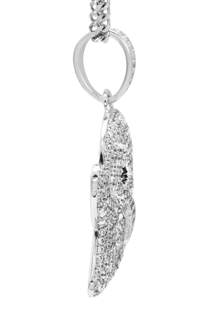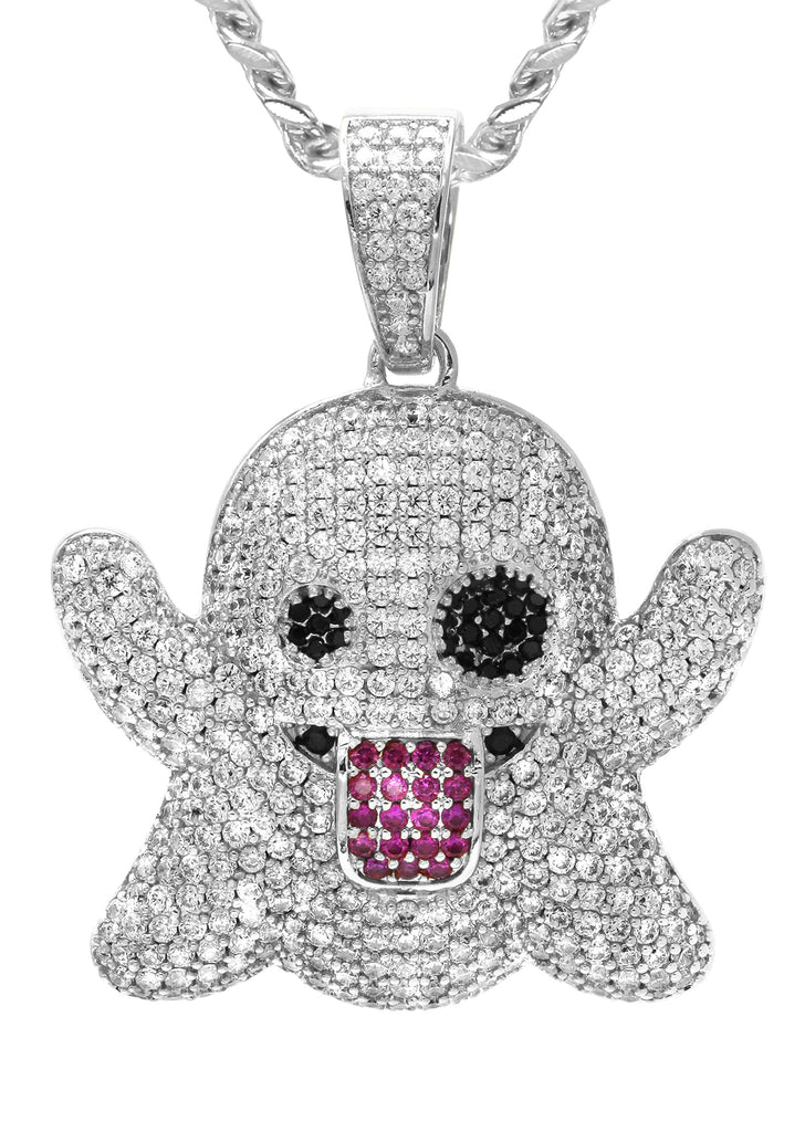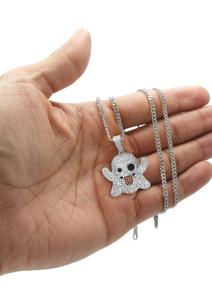 White Gold Plated Cuban Link Chain & Ghost Emoji Pendant Which weighs 18.4 Grams. The Width Of The Pendant Is 1.3 Inches And The Length Of The Pendant Is 1.66 Inches. The Width Of The Chain Is 3mm And The Length Can Be Adjusted Above.