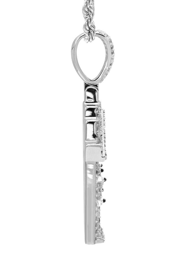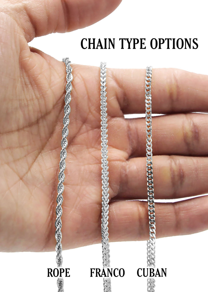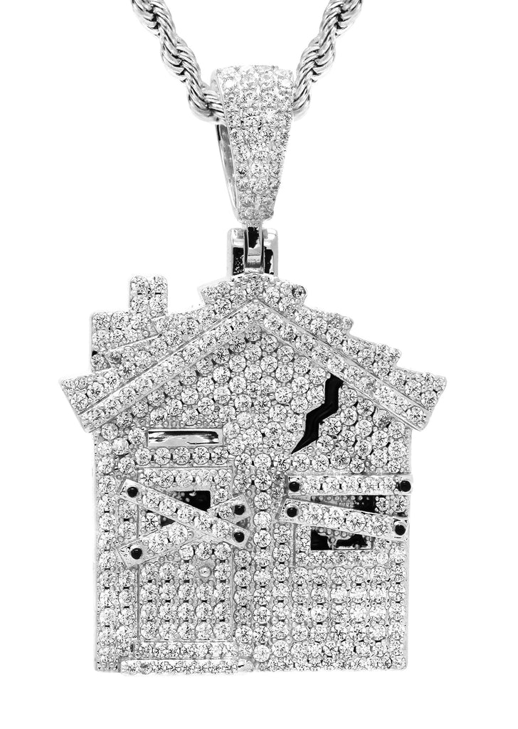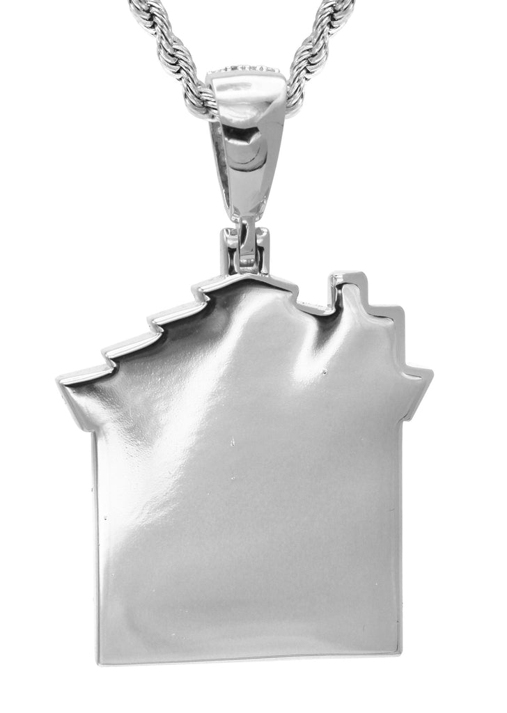 White Gold Plated Rope Chain & House Pendant Which weighs 20 Grams. The Width Of The Pendant Is 1.15 Inches And The Length Of The Pendant Is 1.8 Inches. The Width Of The Chain Is 3mm And The Length Can Be Adjusted Above.