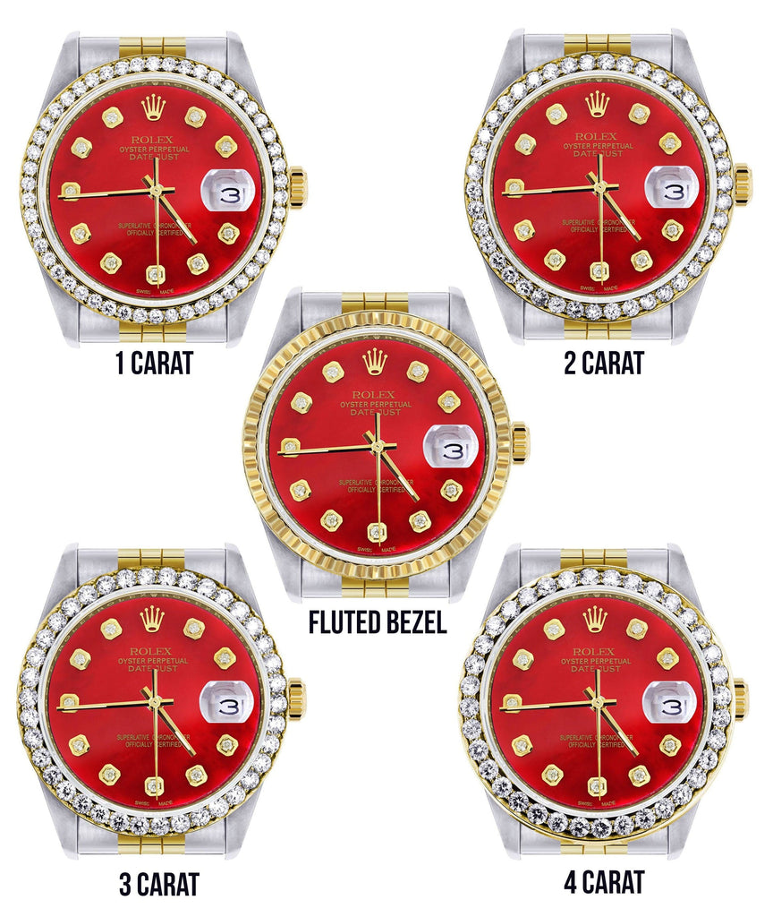 Rolex Datejust 36MM with a Jubilee Band. You can customize the bezel type between Gold Fluted Bezel or Diamond Bezel ranging from 1.00-4.00 carat. Below are more details of the watch.