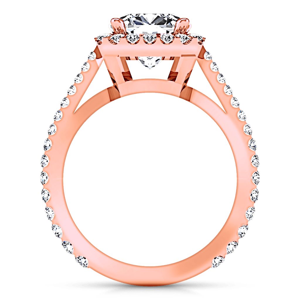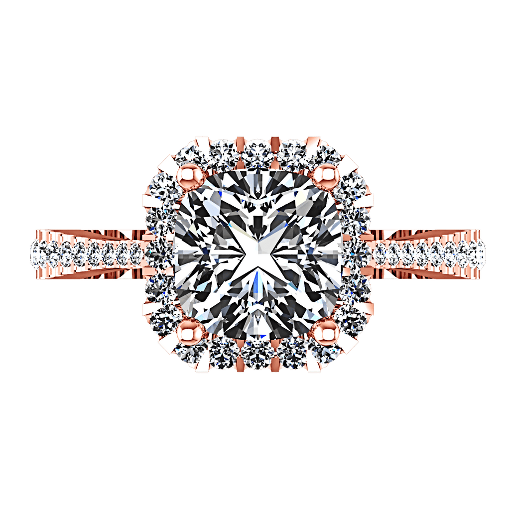 Encircling your Princess or Radiant cut center stone is a glittering array of diamond accents that are sure to look like a sparkling treasure. Featured with 0.75 carats of pave diamonds in 14k rose gold with an average width of 2.5mm . This ring is fully customizable, so pick your center diamond size, color and clarity and we will custom build it for you.