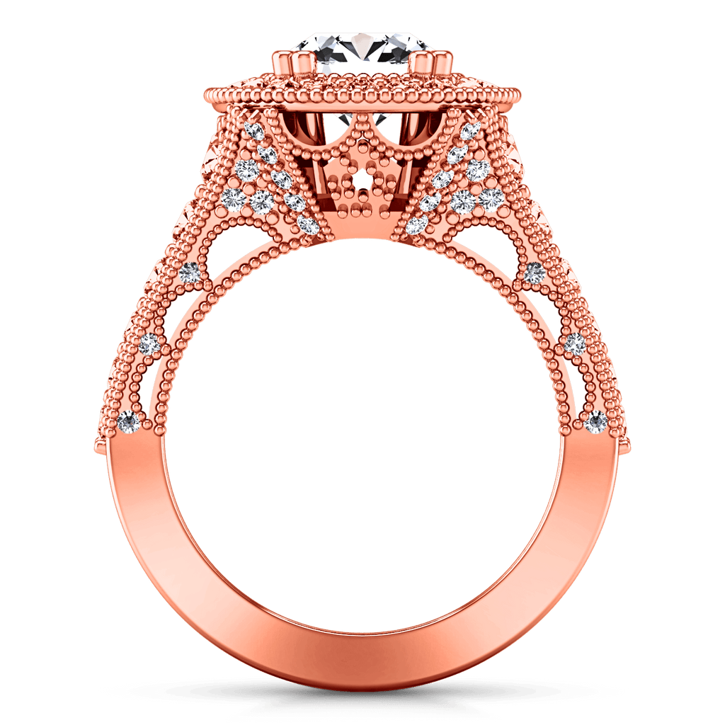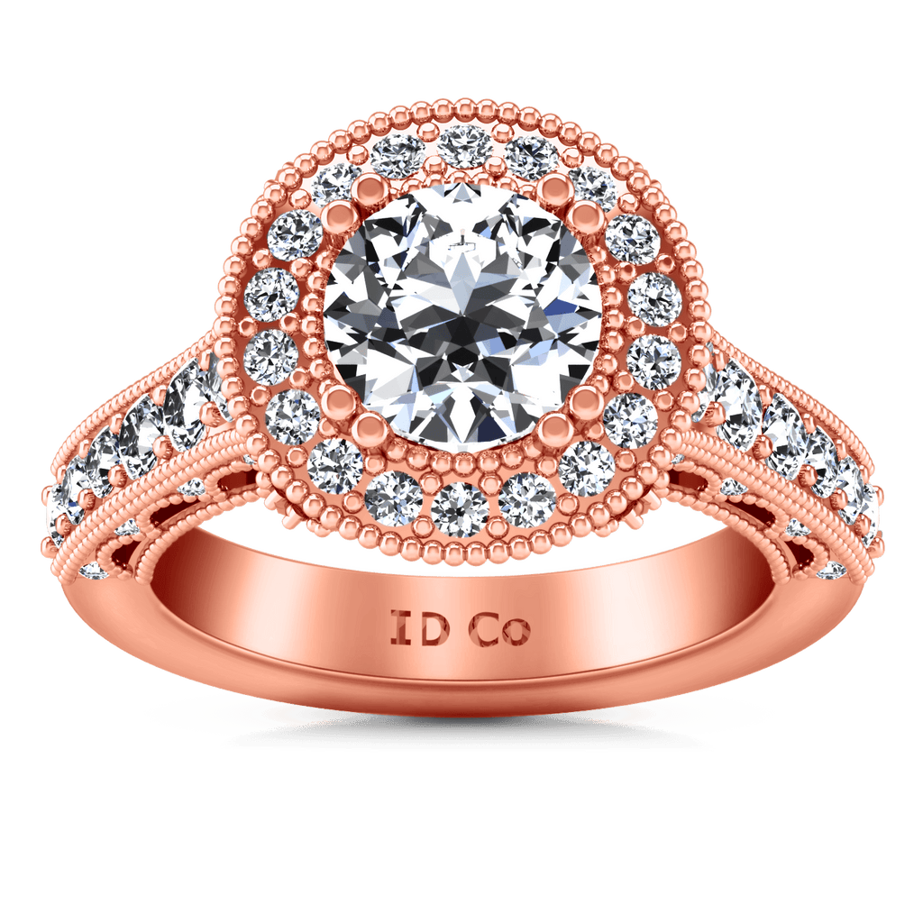 Glamour and brilliance is the masterpiece halo engagement ring which features vintage details and shimmering accent stones enveloping your sparkling center diamond. Featured with 1.25 carats of pave diamonds in 14k rose gold with an average width of 3.5mm . This ring is fully customizable, so pick your center diamond size, color and clarity and we will custom build it for you.