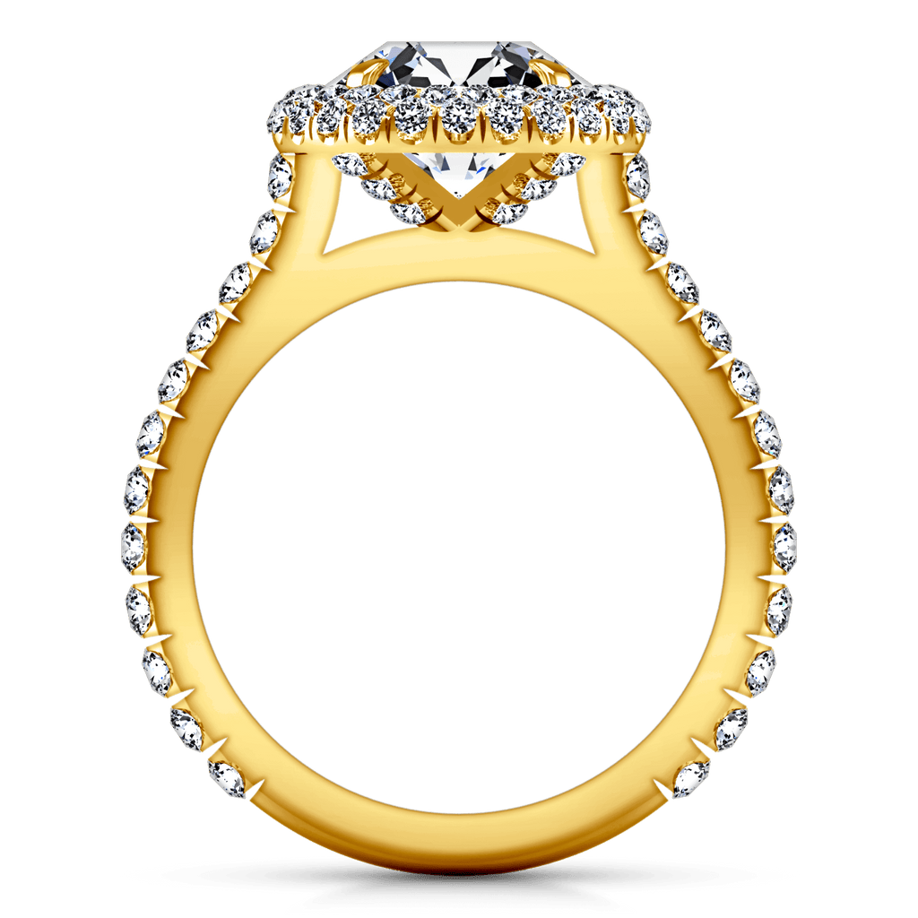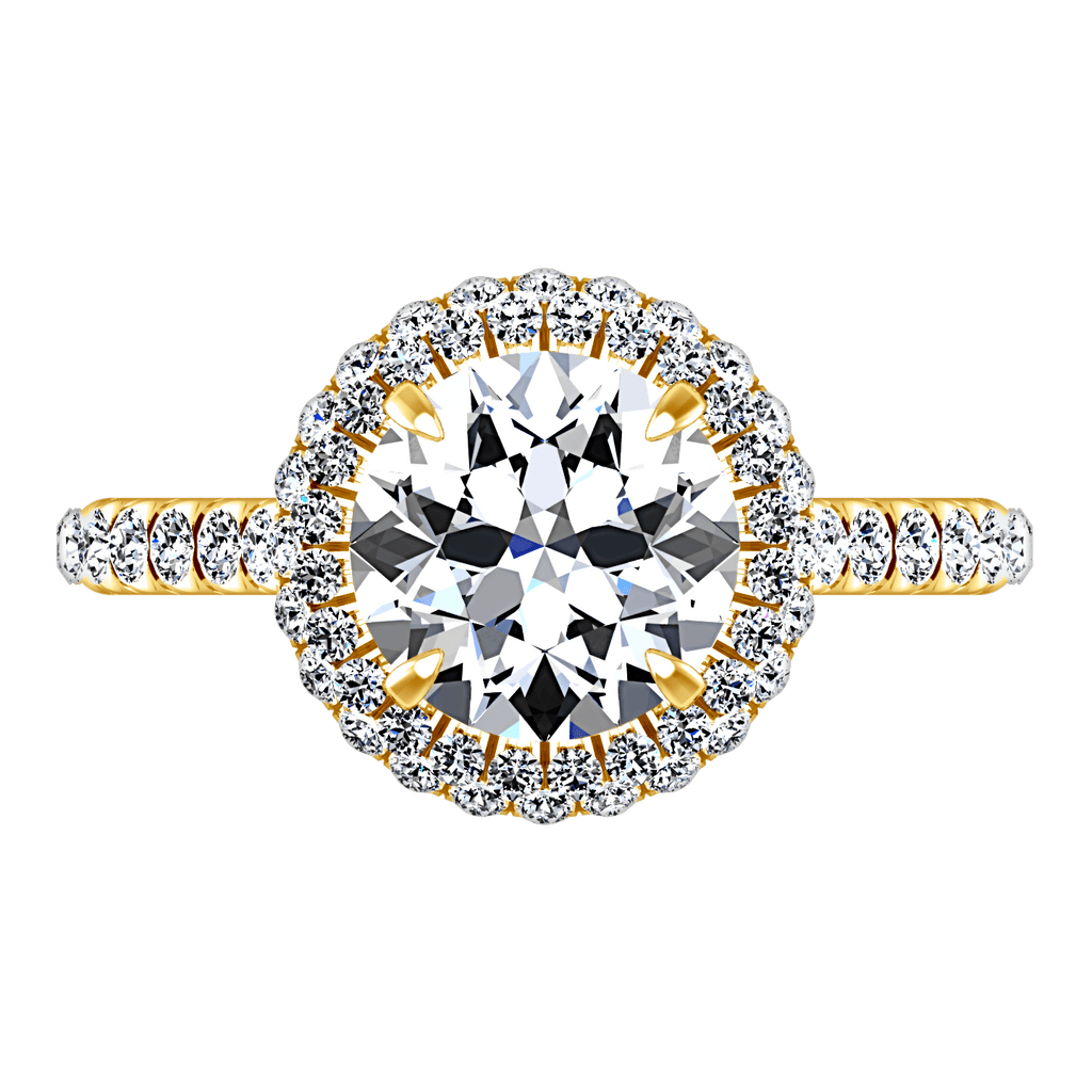 Intricately set diamonds are encircling your dazzling center diamond and also set along the sides to create a stunning and exquisite ring that will be admired forever. Featured with 0.8 carats of pave diamonds in 14k yellow gold with an average width of 2mm . This ring is fully customizable, so pick your center diamond size, color and clarity and we will custom build it for you.