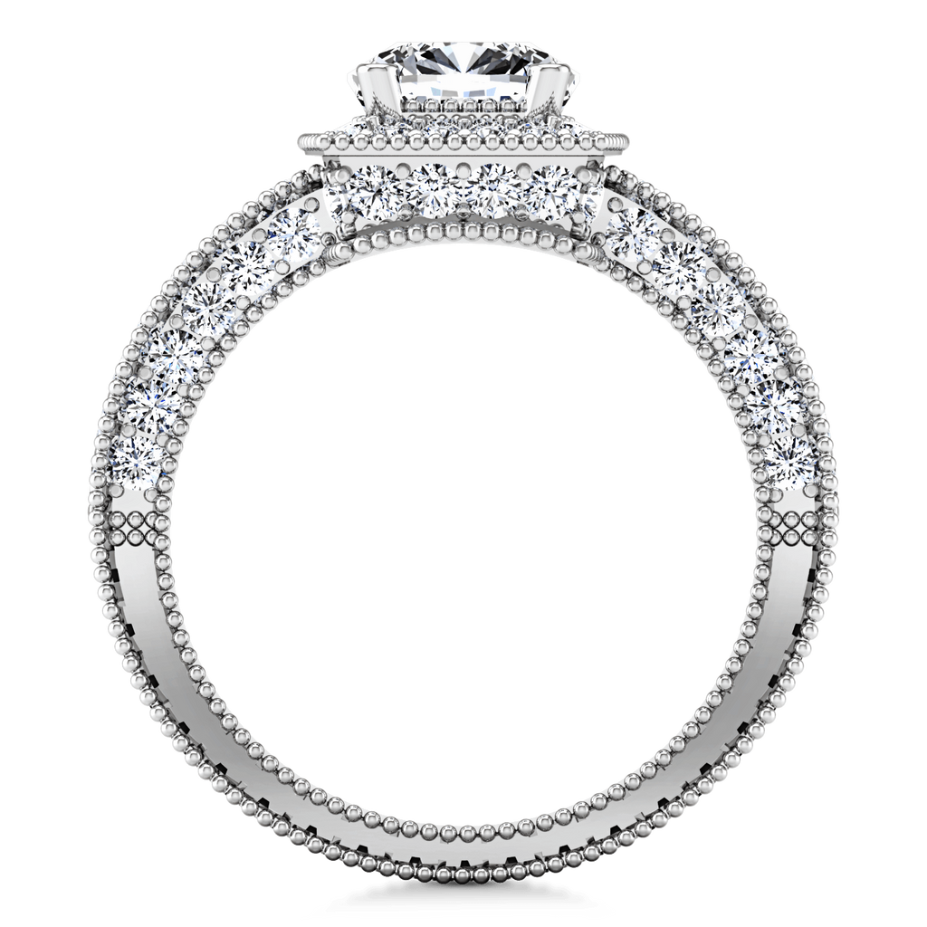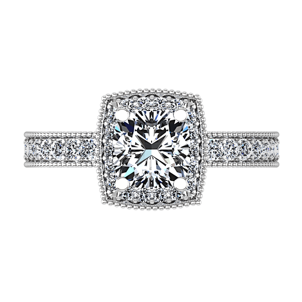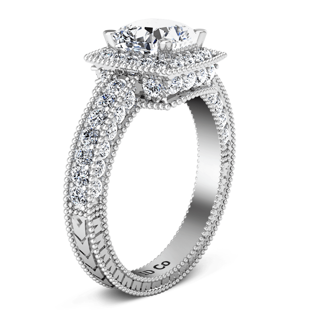 Engraved detailing on the mount and shimmering bead set diamonds set around your brilliant center stone along the sides make this a romantic and sumptuous engagement ring. Featured with 1 carats of pave diamonds in 14k white gold with an average width of 4mm . This ring is fully customizable, so pick your center diamond size, color and clarity and we will custom build it for you.