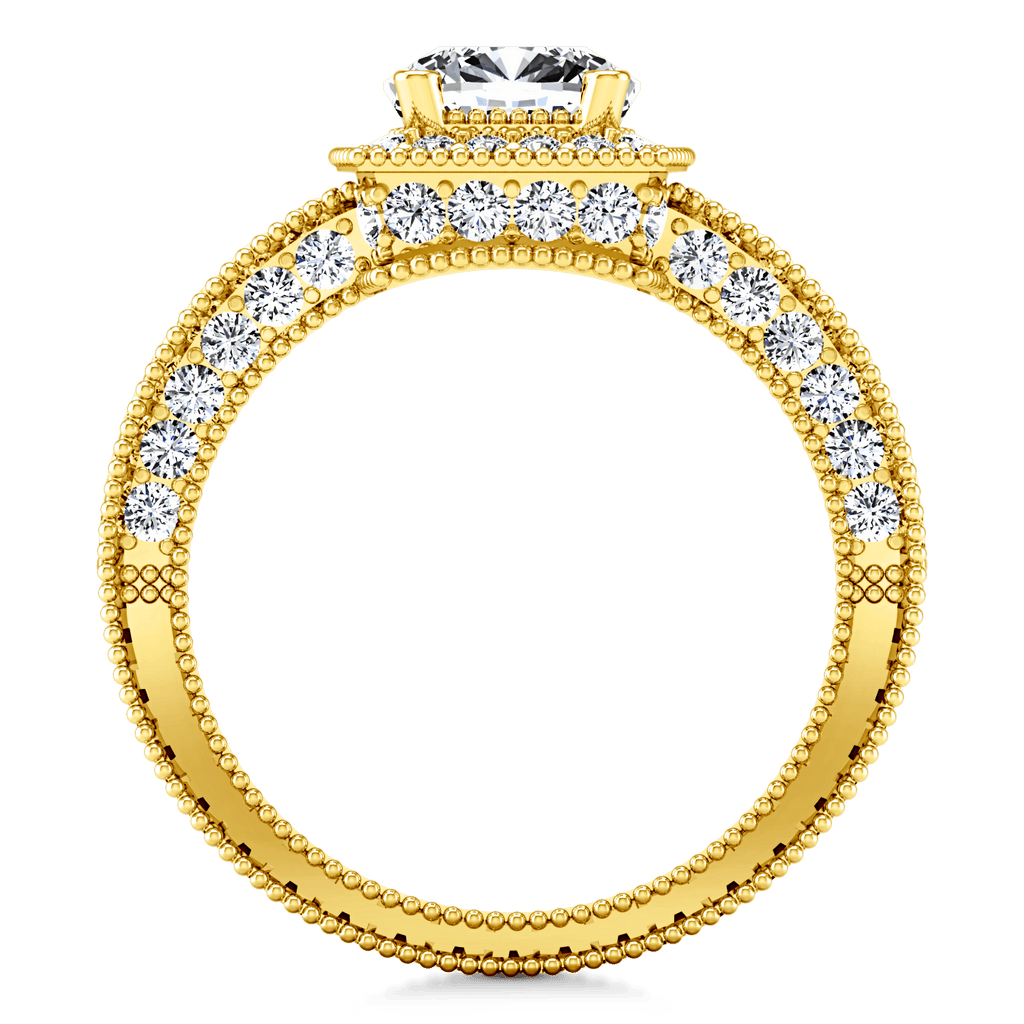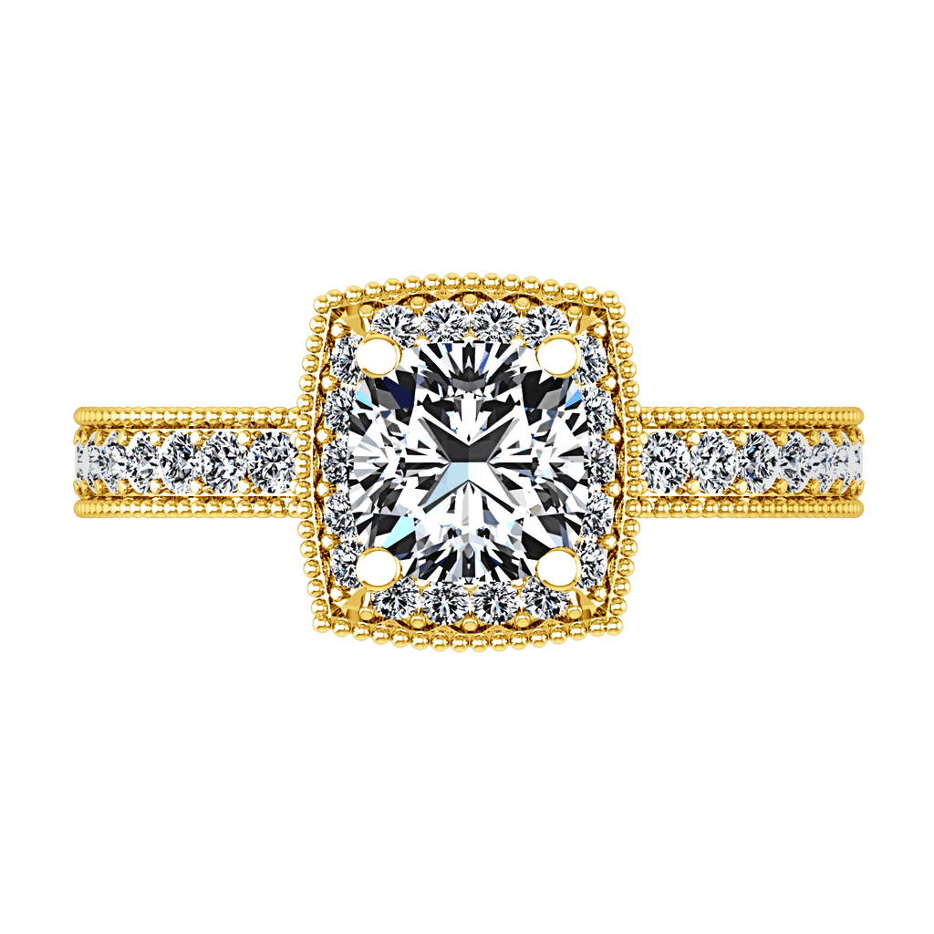 Engraved detailing on the mount and shimmering bead set diamonds set around your brilliant center stone along the sides make this a romantice and sumptuous engagement ring. Featured with 1 carats of pave diamonds in 14k yellow gold with an average width of 4mm . This ring is fully customizable, so pick your center diamond size, color and clarity and we will custom build it for you.