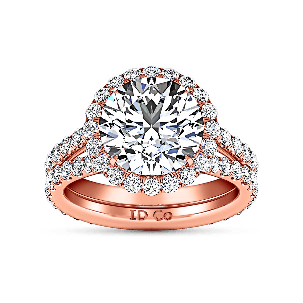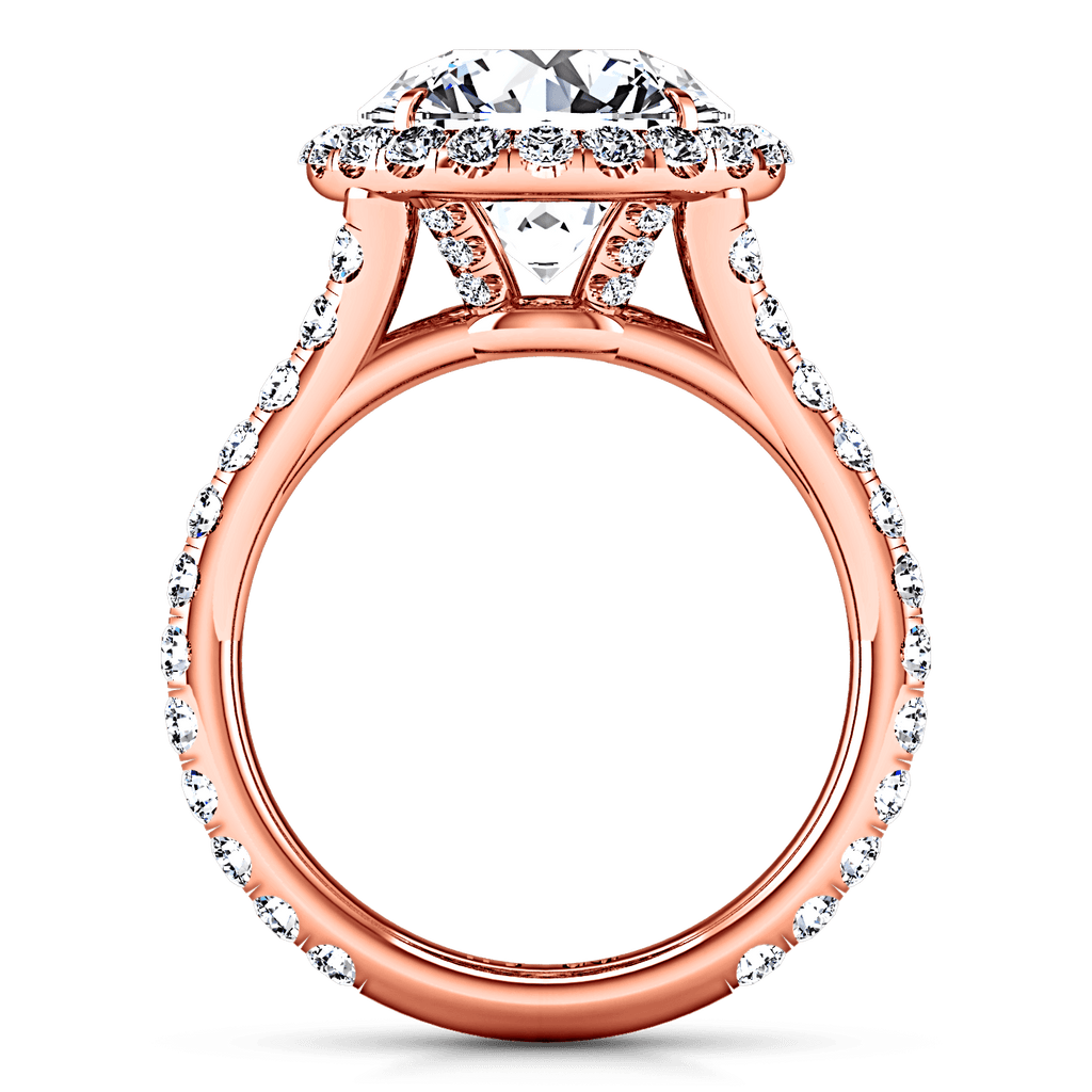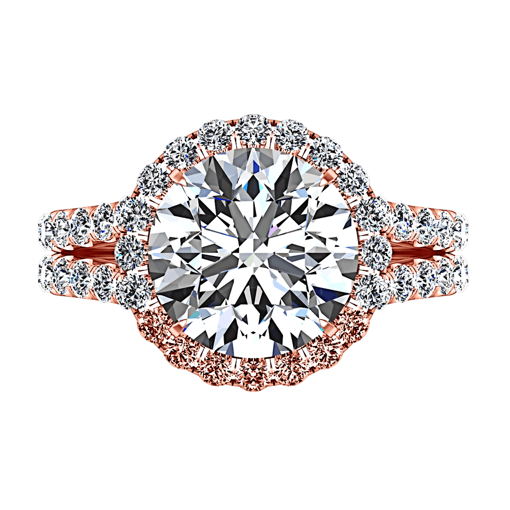 A vision of pure romance and elegance, this regal ring features diamonds encircling your center stone in a halo with accents diamonds set in a split shank. Featured with 1.25 carats of pave diamonds in 14k rose gold with an average width of 4mm . This ring is fully customizable, so pick your center diamond size, color and clarity and we will custom build it for you.