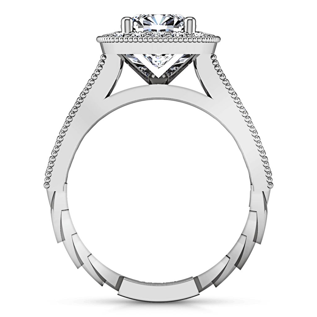 This ring features shimmering diamond accents set in a Halo design and dead set diamonds along the side with intricate design in the ring shank. Featured with 0.5 carats of pave diamonds in 14k white gold with an average width of 2.5mm . This ring is fully customizable, so pick your center diamond size, color and clarity and we will custom build it for you.