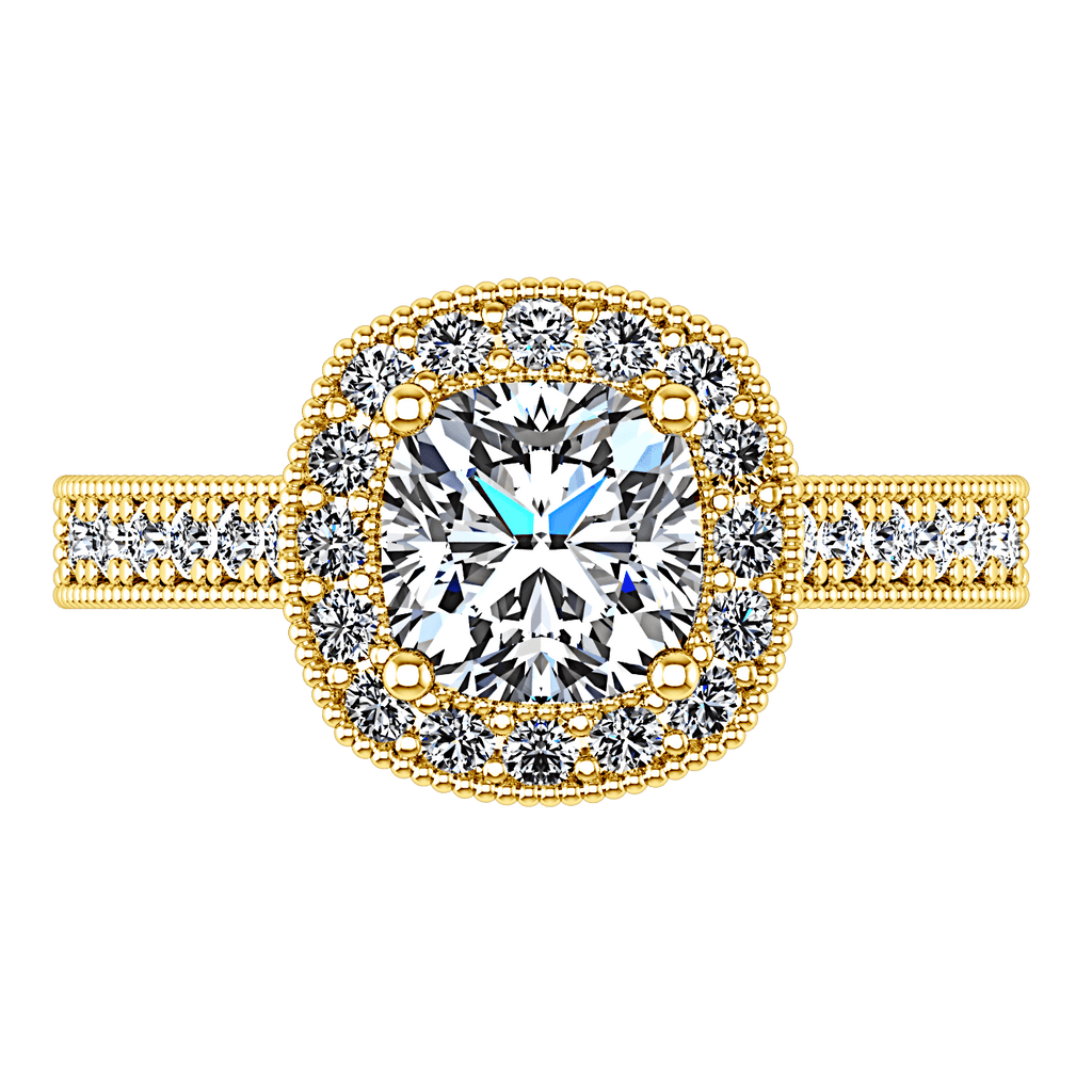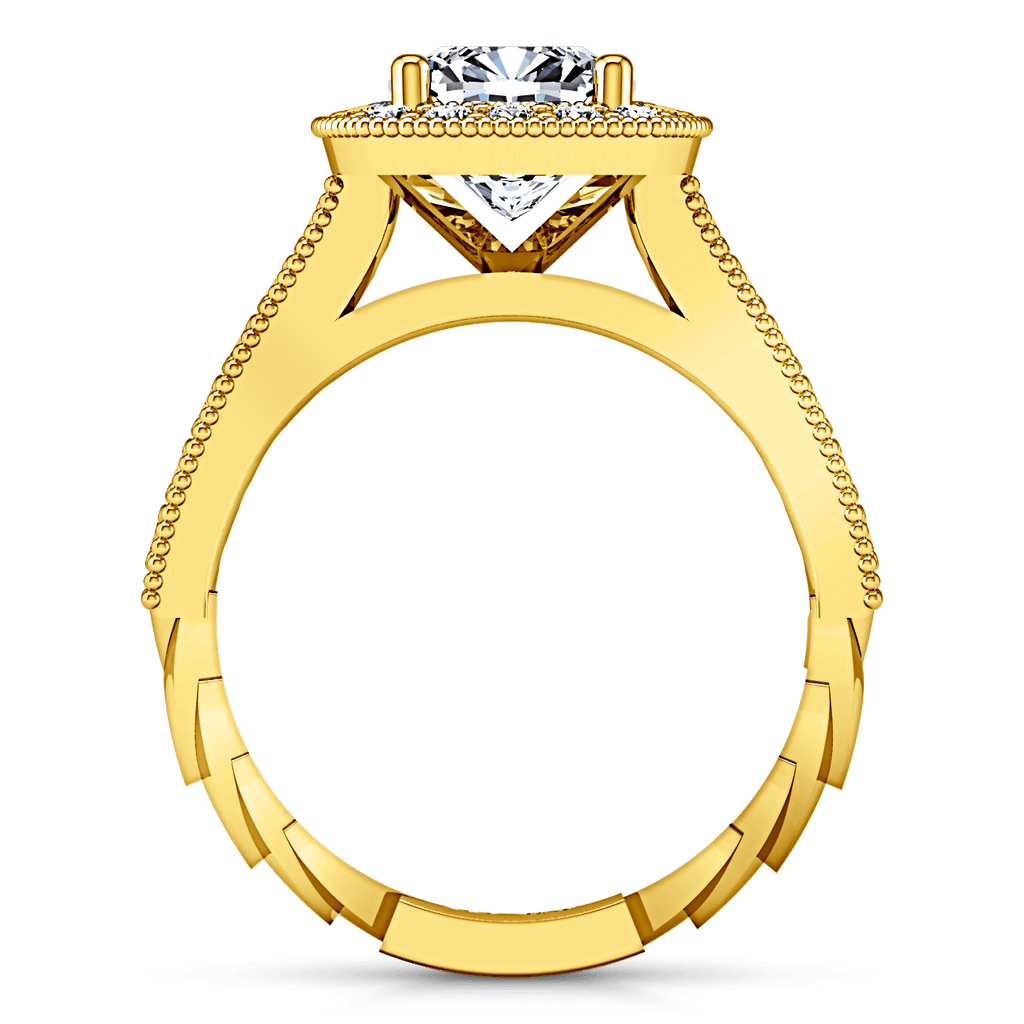 This ring features shimmering diamond accents set in a Halo design and dead set diamonds along the side with intricate design in the ring shank. Featured with 0.5 carats of pave diamonds in 14k yellow gold with an average width of 2.5mm . This ring is fully customizable, so pick your center diamond size, color and clarity and we will custom build it for you.