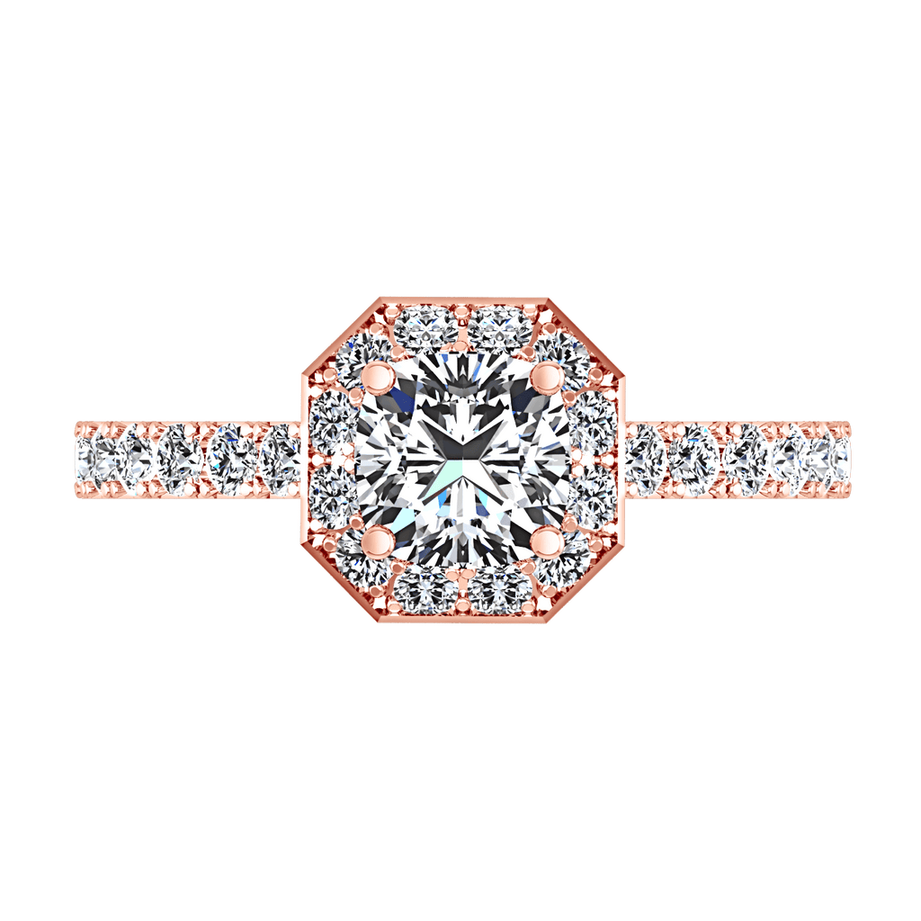 This ring features a unique octagon diamond set halo design with bead set diamonds along the sides to create a classic yet ornate look. Featured with 0.9 carats of pave diamonds in 14k rose gold with an average width of 2mm . This ring is fully customizable, so pick your center diamond size, color and clarity and we will custom build it for you.