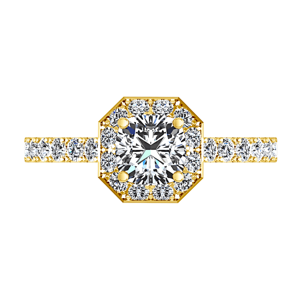 This ring features a unique octagon diamond set halo design with bead set diamonds along the sides to create a classic yet ornate look. Featured with 0.9 carats of pave diamonds in 14k yellow gold with an average width of 2mm . This ring is fully customizable, so pick your center diamond size, color and clarity and we will custom build it for you.
