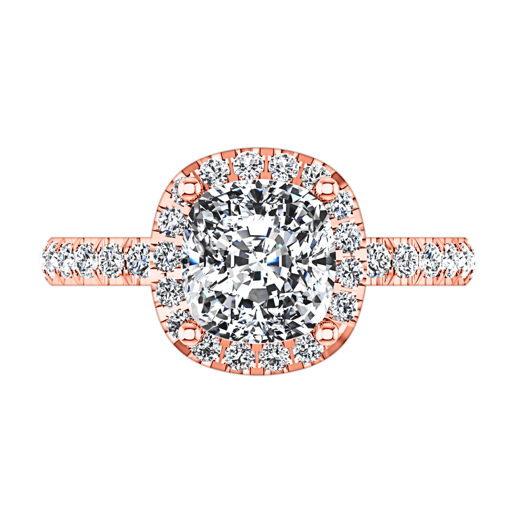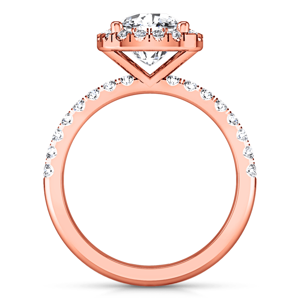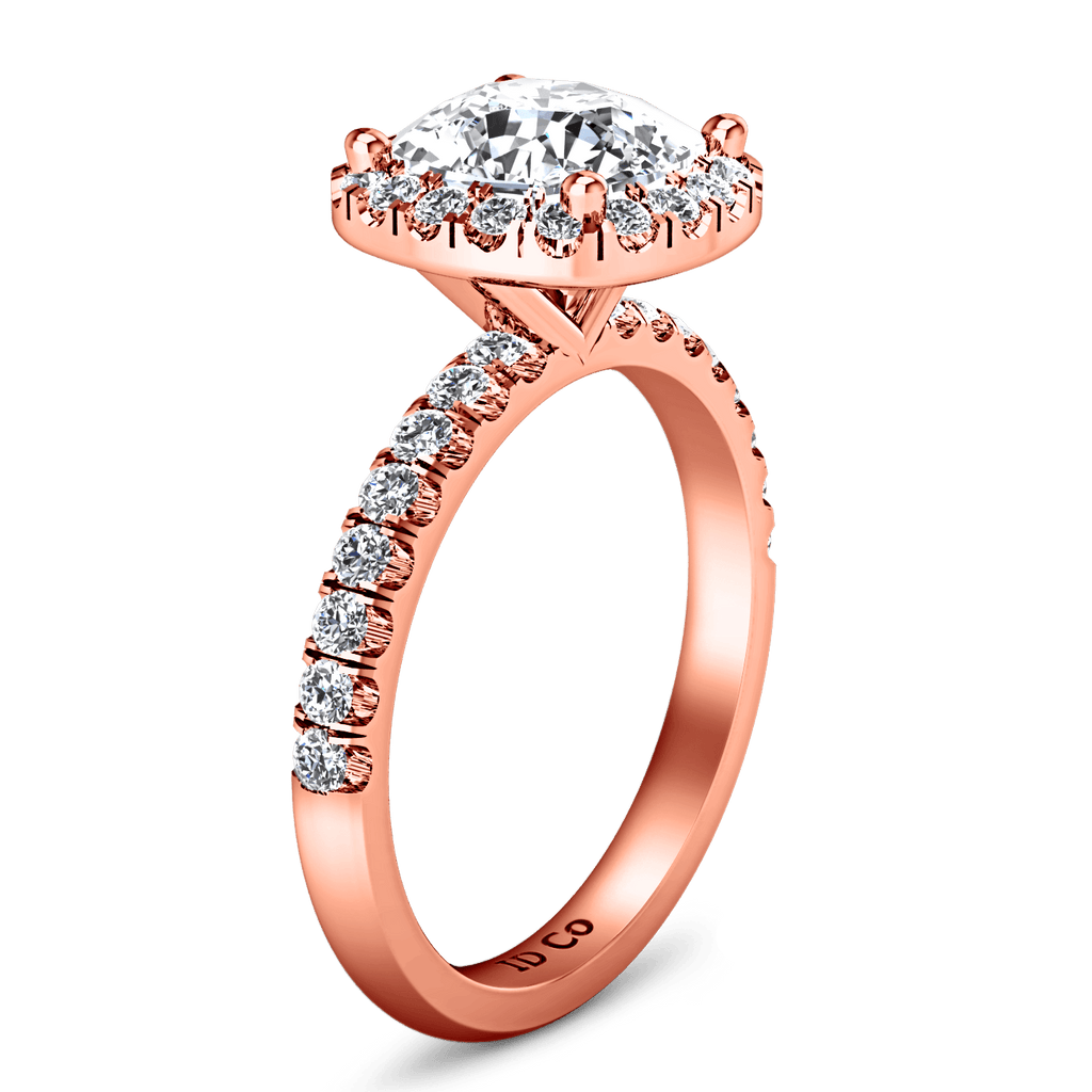 Your shimmering center diamond is gently caressed on all sides by demure and shimmering diamonds in this halo design with delicate bead set diamonds along the shank. Featured with 0.6 carats of pave diamonds in 14k rose gold with an average width of 2mm . This ring is fully customizable, so pick your center diamond size, color and clarity and we will custom build it for you.