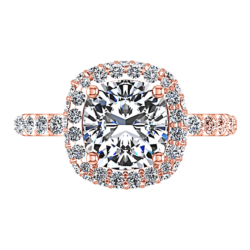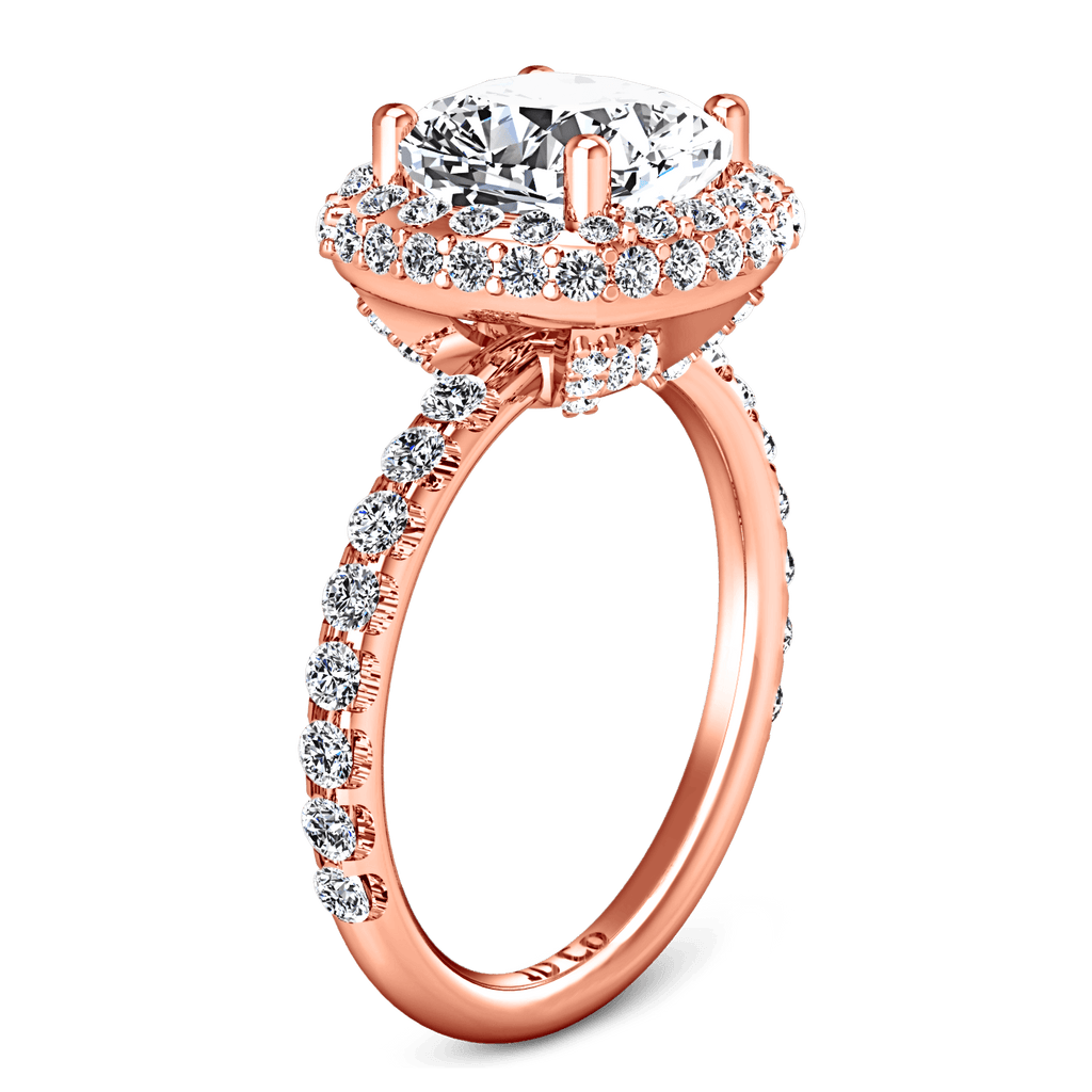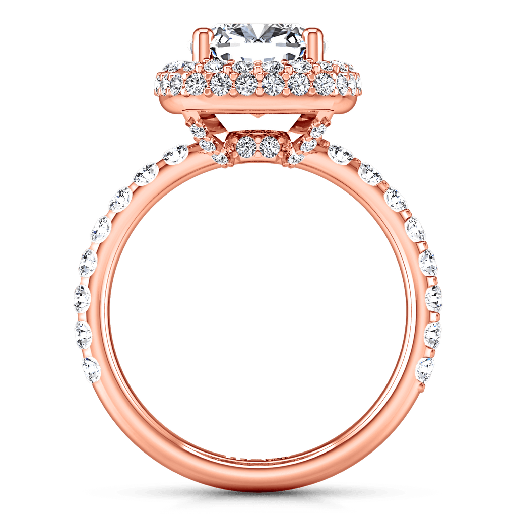 This ring is a timeless beauty featuring delicately set accent diamonds encircling your luminous center stone and bead set diamonds along the sides. Featured with 0.9 carats of pave diamonds in 14k rose gold with an average width of 2mm . This ring is fully customizable, so pick your center diamond size, color and clarity and we will custom build it for you.