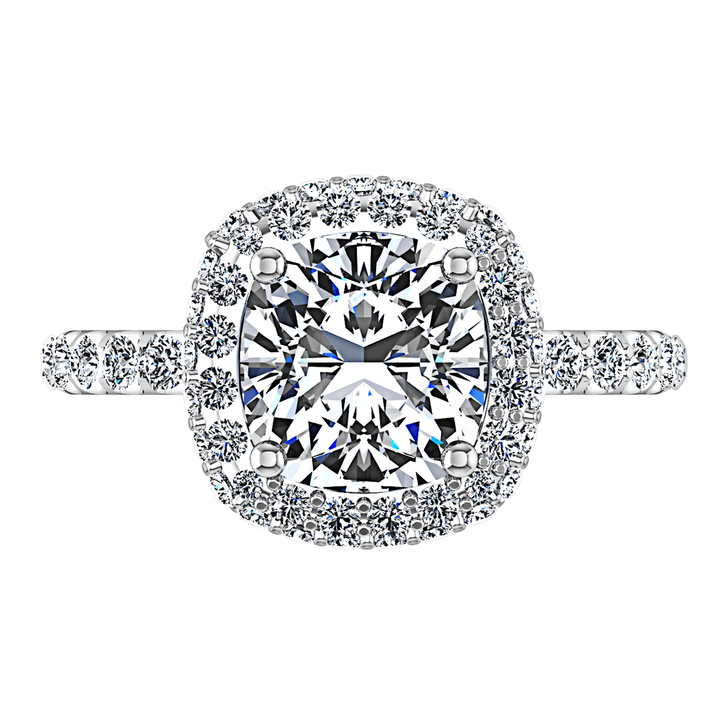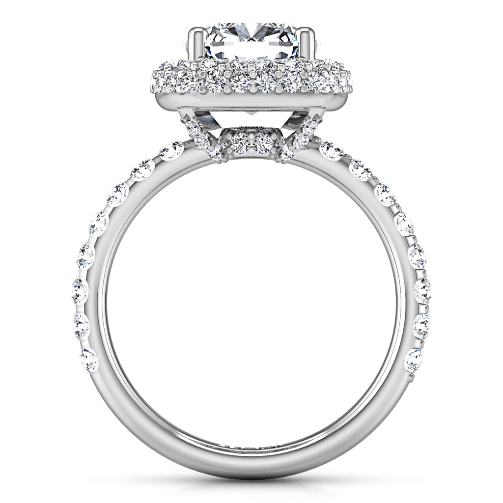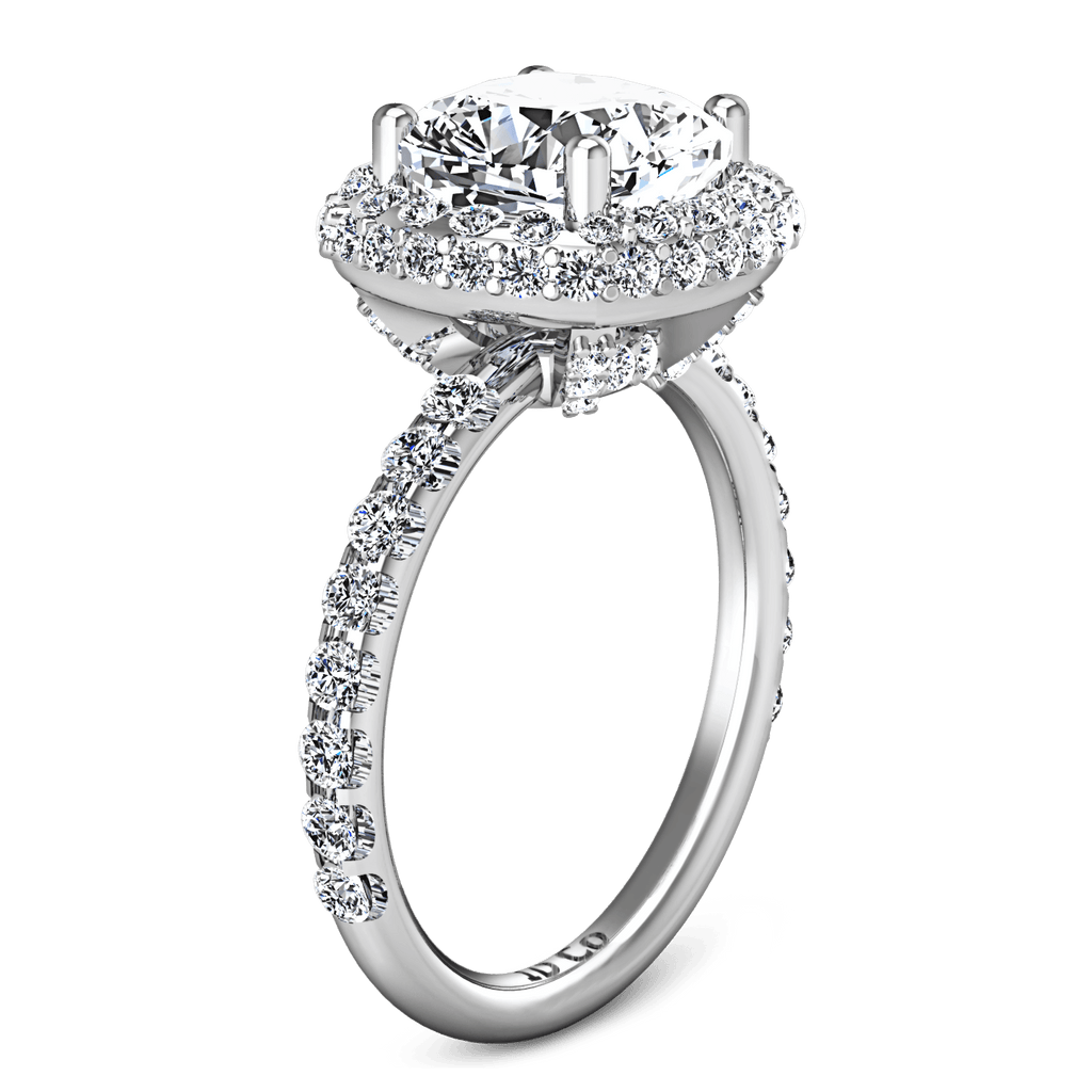 This ring is a timeless beauty featuring delicately set accent diamonds encircling your luminous center stone and bead set diamonds along the sides. Featured with 0.9 carats of pave diamonds in 14k white gold with an average width of 2mm . This ring is fully customizable, so pick your center diamond size, color and clarity and we will custom build it for you.