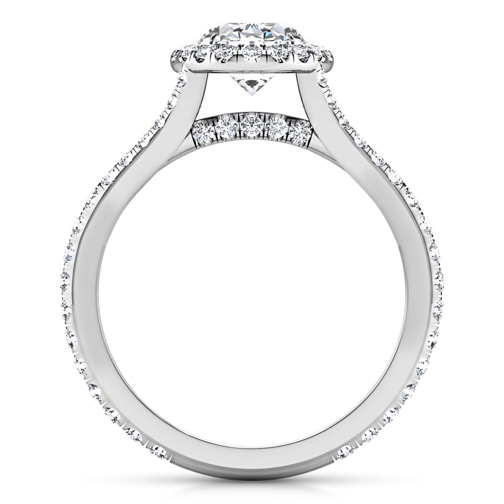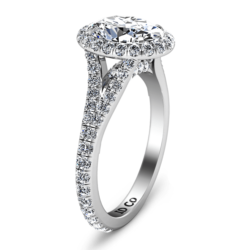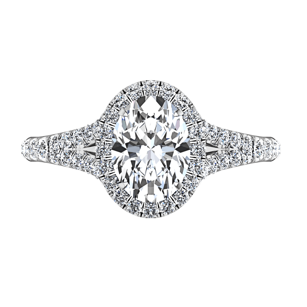 Your resplendent Oval cut will be wrapped with shimmering diamonds in this petite diamond set split shank mounting. Featured with 0.65 carats of pave diamonds in 14k white gold with an average width of 2mm . This ring is fully customizable, so pick your center diamond size, color and clarity and we will custom build it for you.