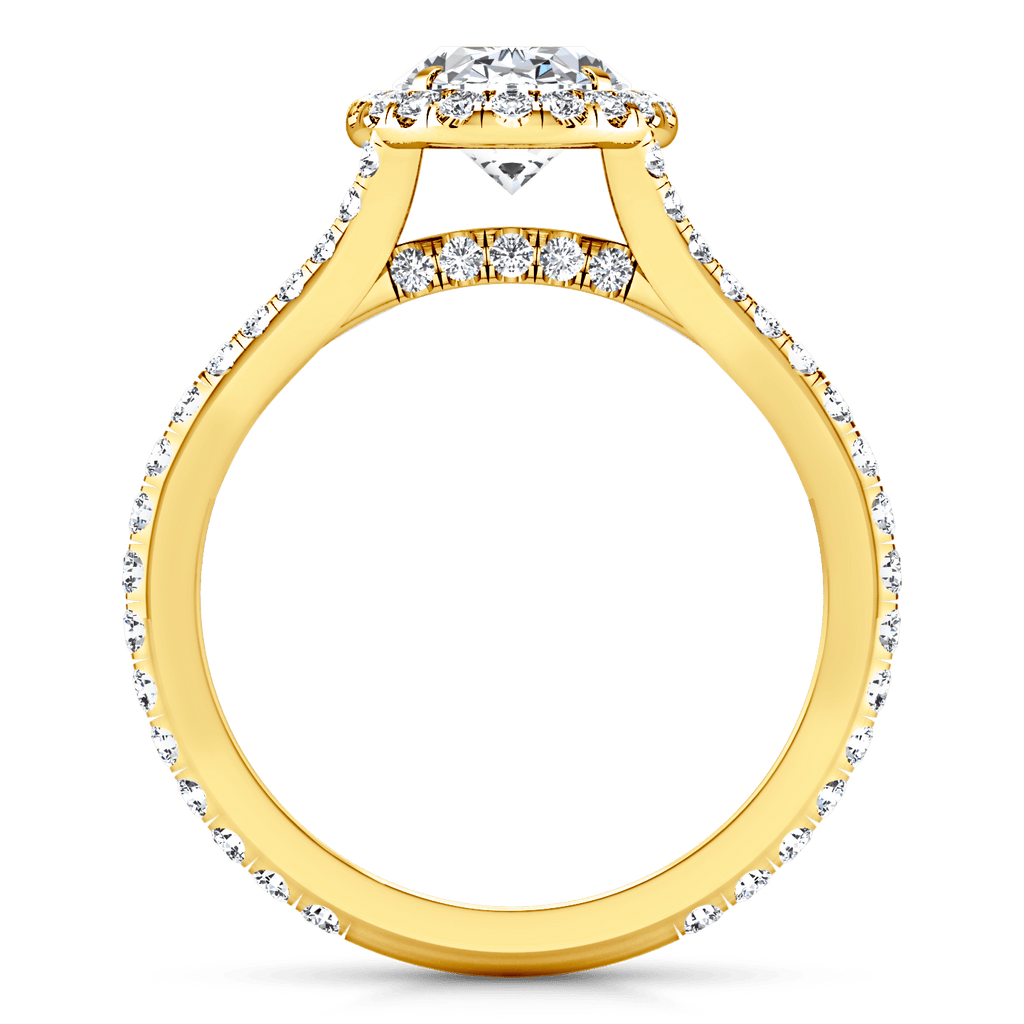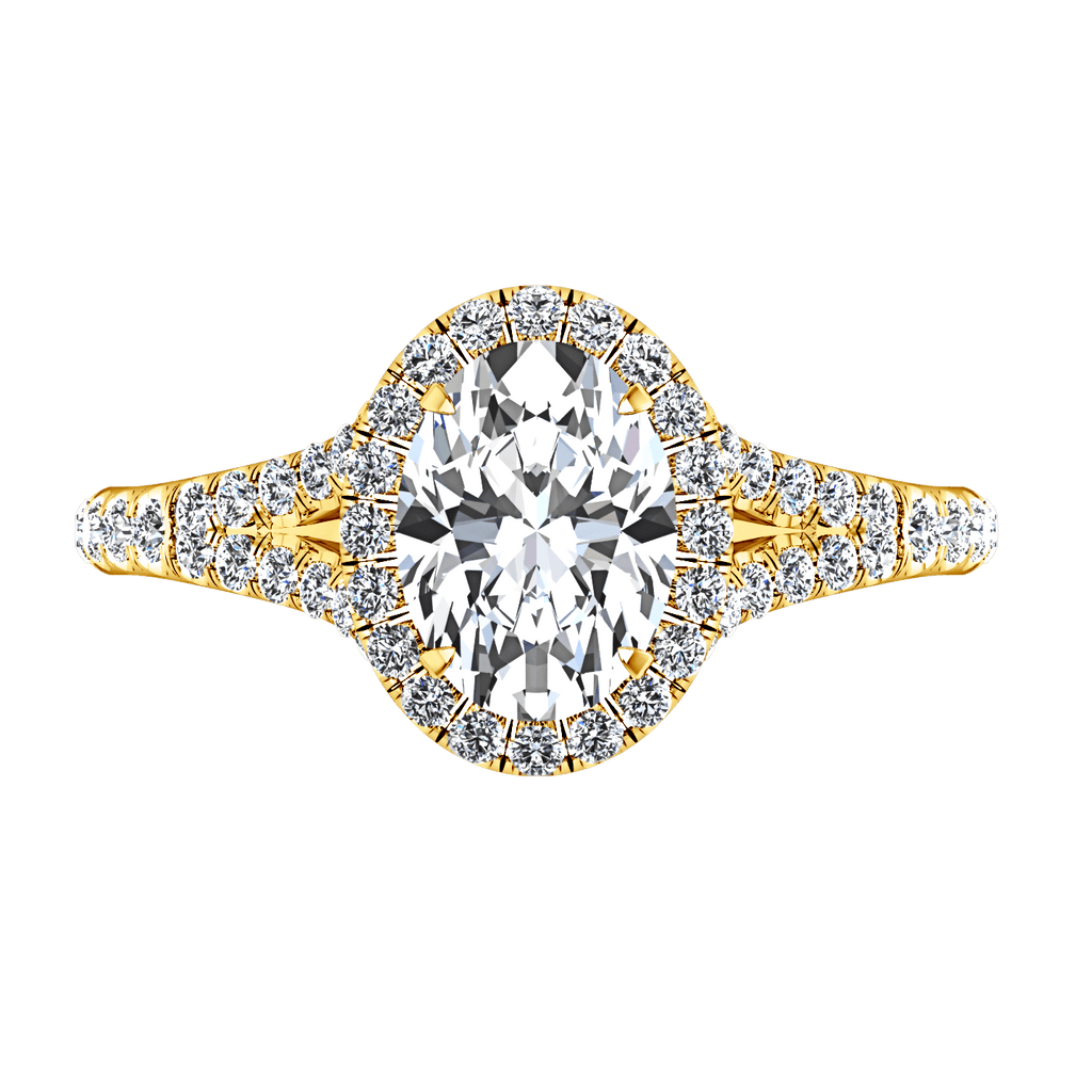 Your resplendent Oval cut will be wrapped with shimmering diamonds in this petite diamond set split shank mounting. Featured with 0.65 carats of pave diamonds in 14k yellow gold with an average width of 2mm . This ring is fully customizable, so pick your center diamond size, color and clarity and we will custom build it for you.