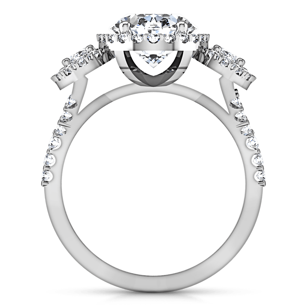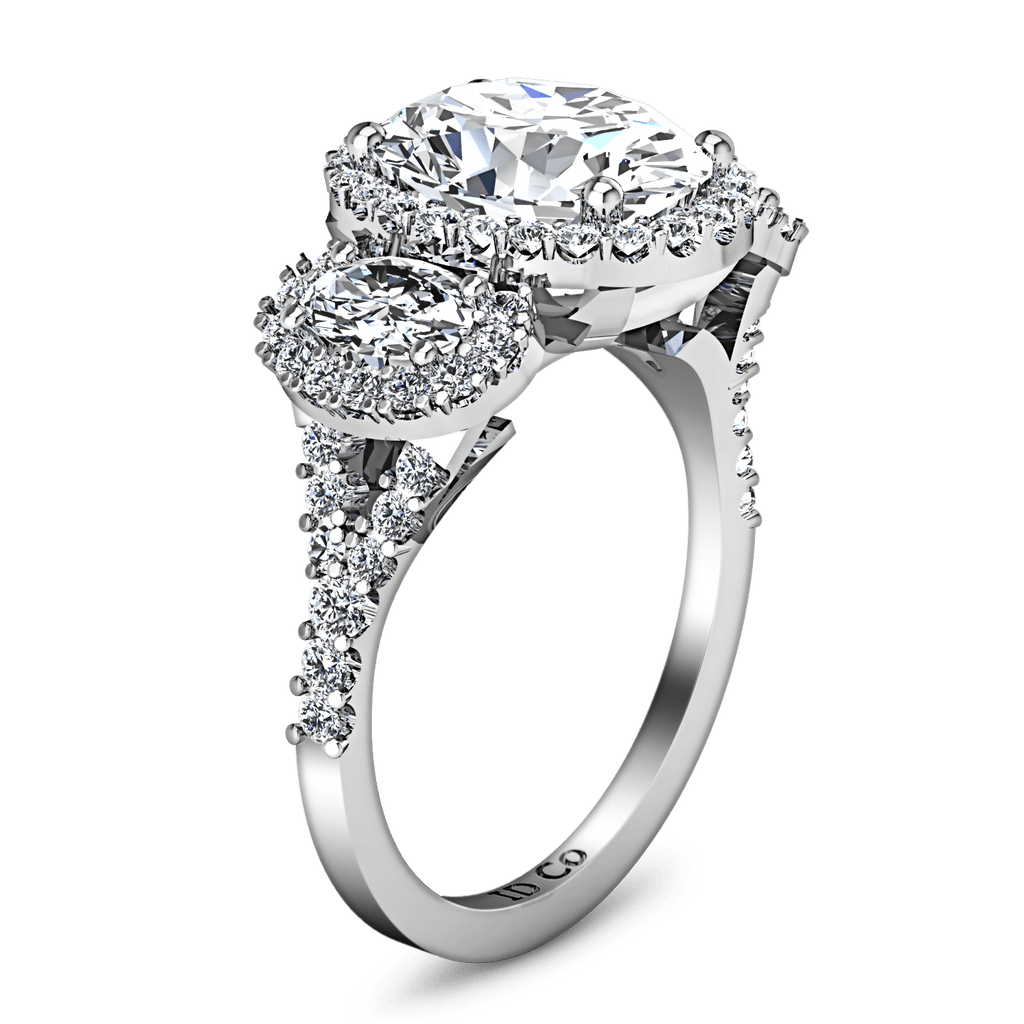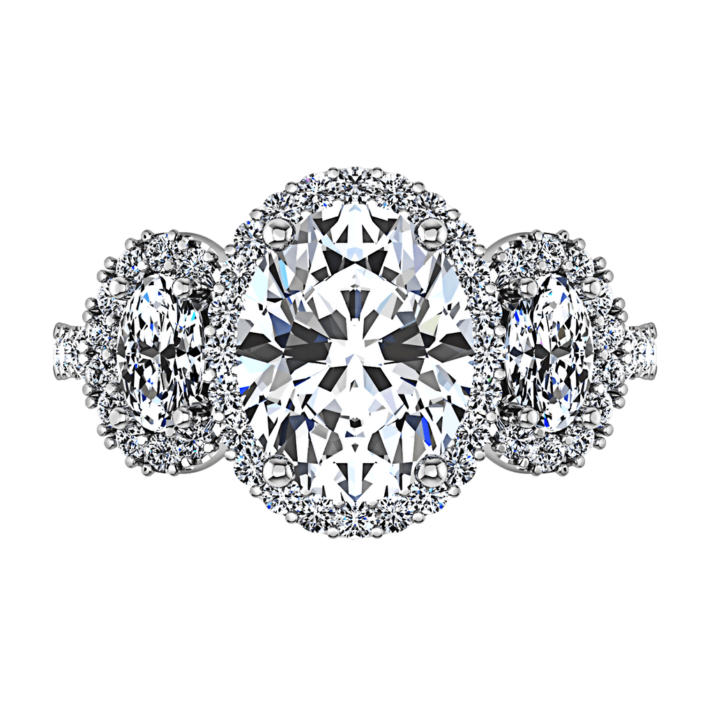 This ring is an absolutely stunning head turning masterpiece, elegant oval shaped diamonds are encircled by glittering diamond accent stones that are also set along the sides to create a knockout ring. Featured with 0.7 carats of pave diamonds in 14k white gold with an average width of 2mm . This ring is fully customizable, so pick your center diamond size, color and clarity and we will custom build it for you.