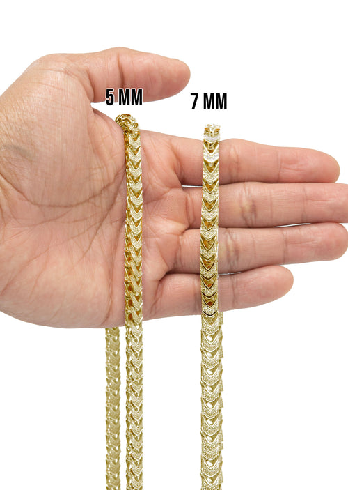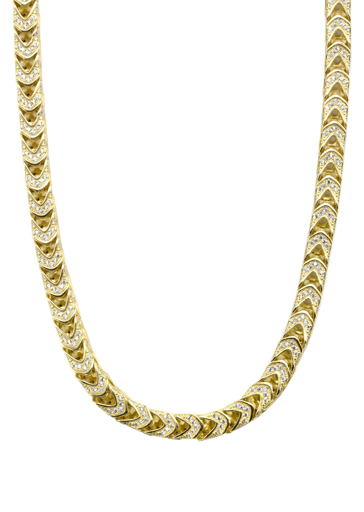 Pure 925 Silver Gold Iced Out Franco Chain Chain which has been gold bonded over 6 times with 14K Gold for premium quality and durability. These chains are fully customizable, so you can pick your length & width above. Once you select your length & width, you can see the adjusted gram weight below the price. The chain is also water proof which will provide long lasting wear under any condition.