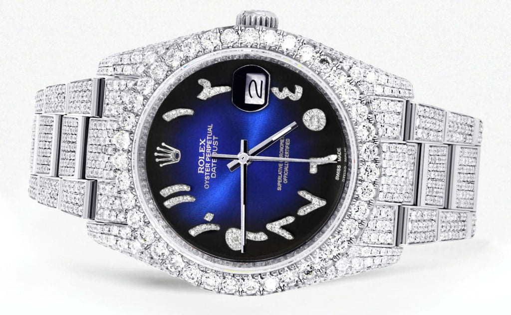 Iced Out Rolex Datejust 36 MM | Stainless Steel | 10 Carats of Diamonds | Blue Black Arabic Diamond Dial | Oyster Band
