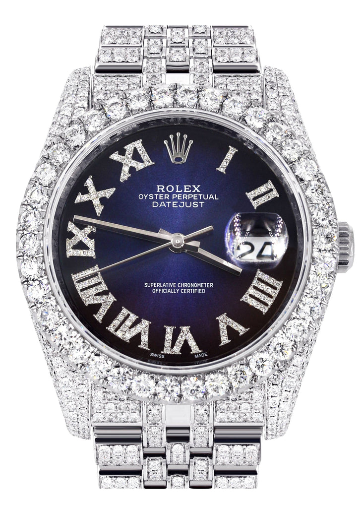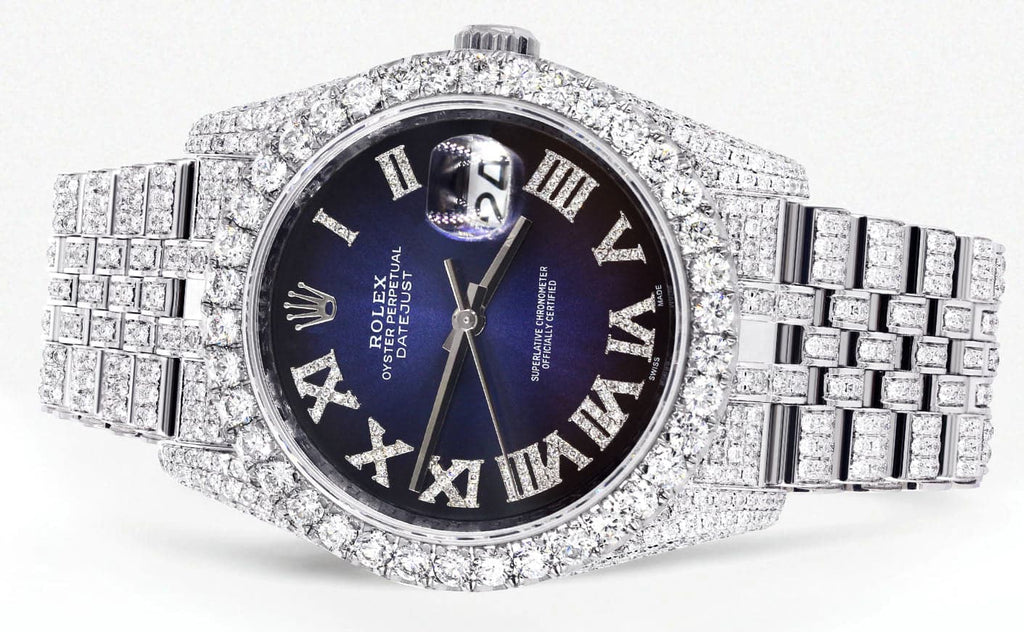 Iced Out Rolex Datejust 36 MM | Stainless Steel | 16.5 Carats of Diamonds | Blue Black Roman Diamond Dial | Jubilee Band