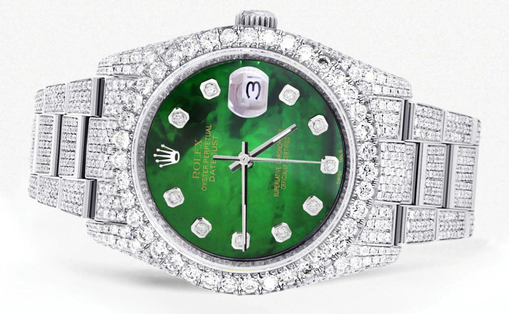 Iced Out Rolex Datejust 36 MM | Stainless Steel | 16.5 Carats of Diamonds | Green Mother of Pearl Diamond Dial | Oyster Band | Model 116200