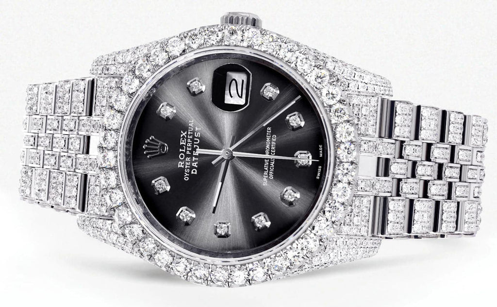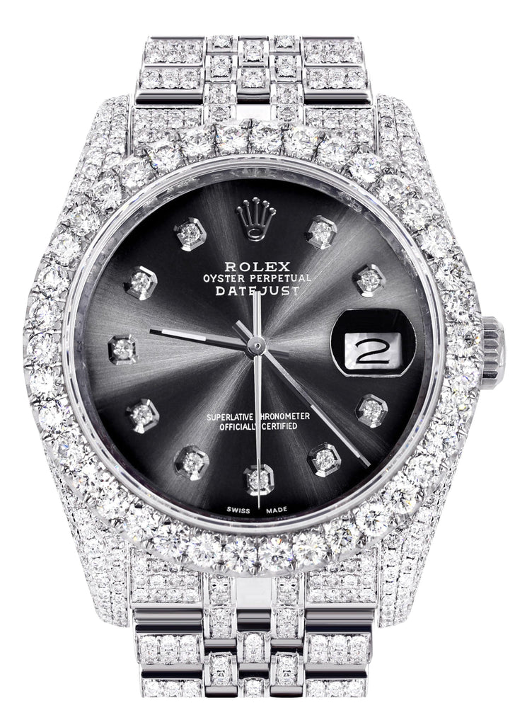 Iced Out Rolex Datejust 36 MM | Stainless Steel | 16.5 Carats of Diamonds | Jet Black Diamond Dial | Jubilee Band | Model 116200