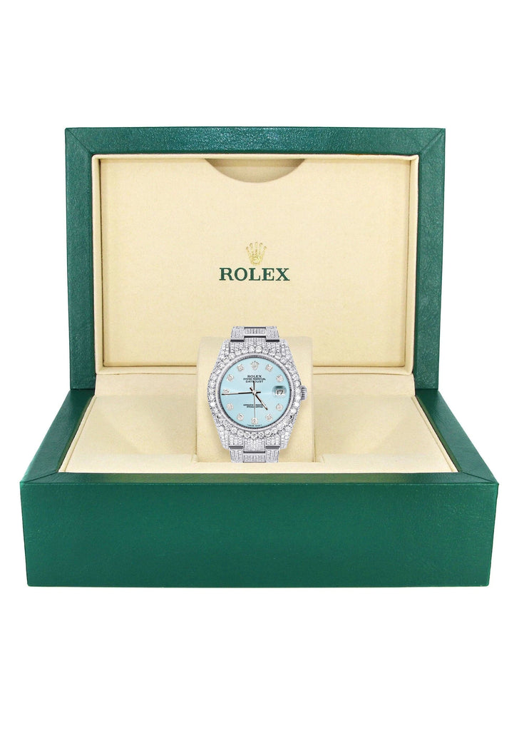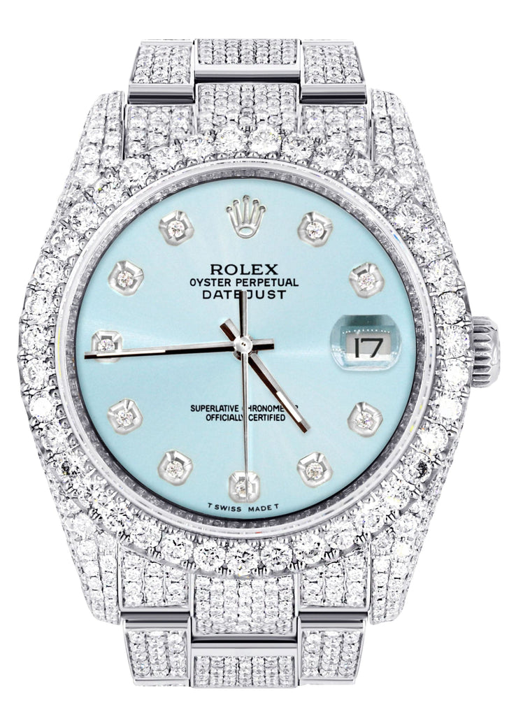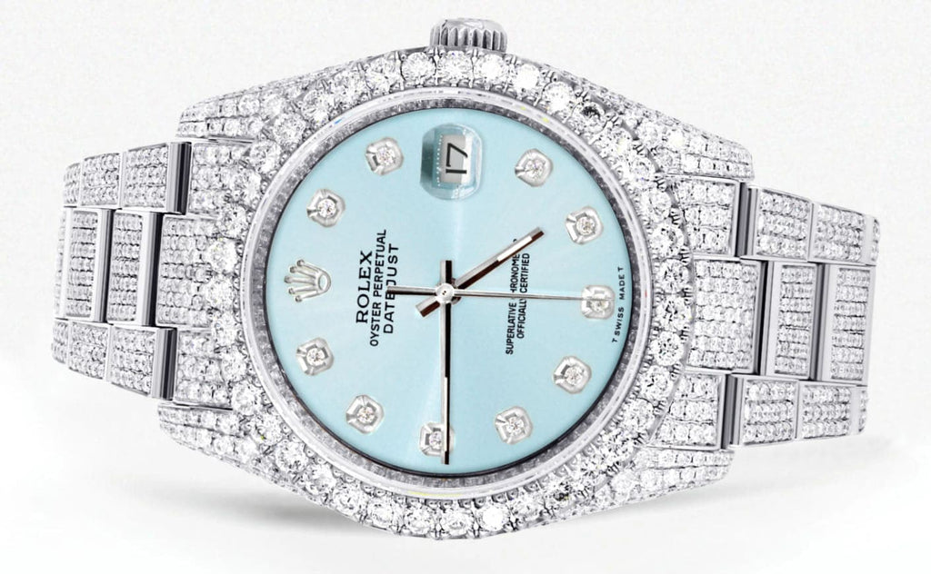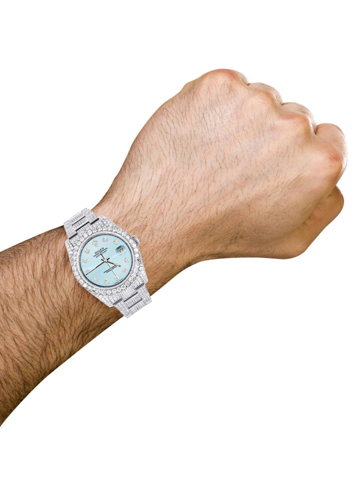 Iced Out Rolex Datejust 36 MM | Stainless Steel | 16.5 Carats of Diamonds | Light Blue Diamond Dial | Oyster Band | Model 116200