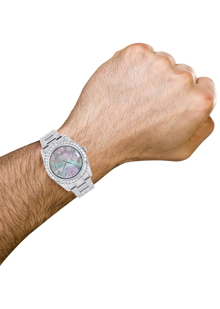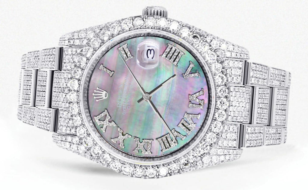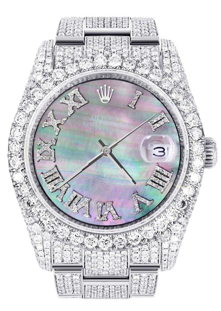Iced Out Rolex Datejust 36 MM | Stainless Steel | 16.5 Carats of Diamonds | Mother of Pearl Roman Diamond Dial | Oyster Band | Model 116200