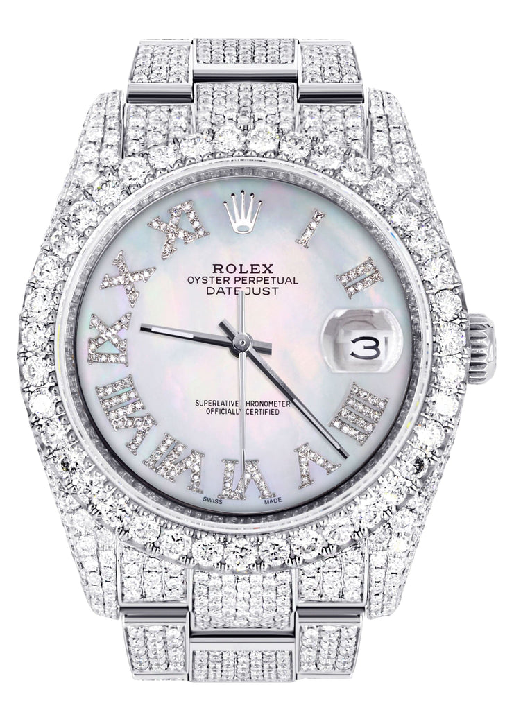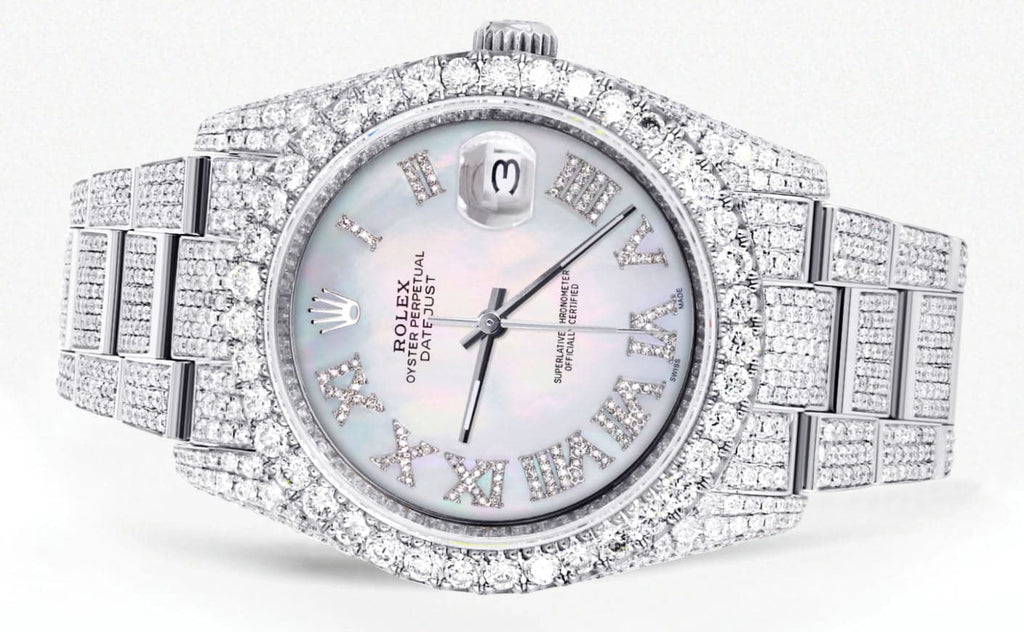 Iced Out Rolex Datejust 36 MM | Stainless Steel | 16.5 Carats of Diamonds | Mother of Pearl Roman Diamond Dial | Oyster Band | Model 116200