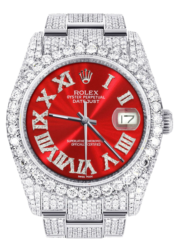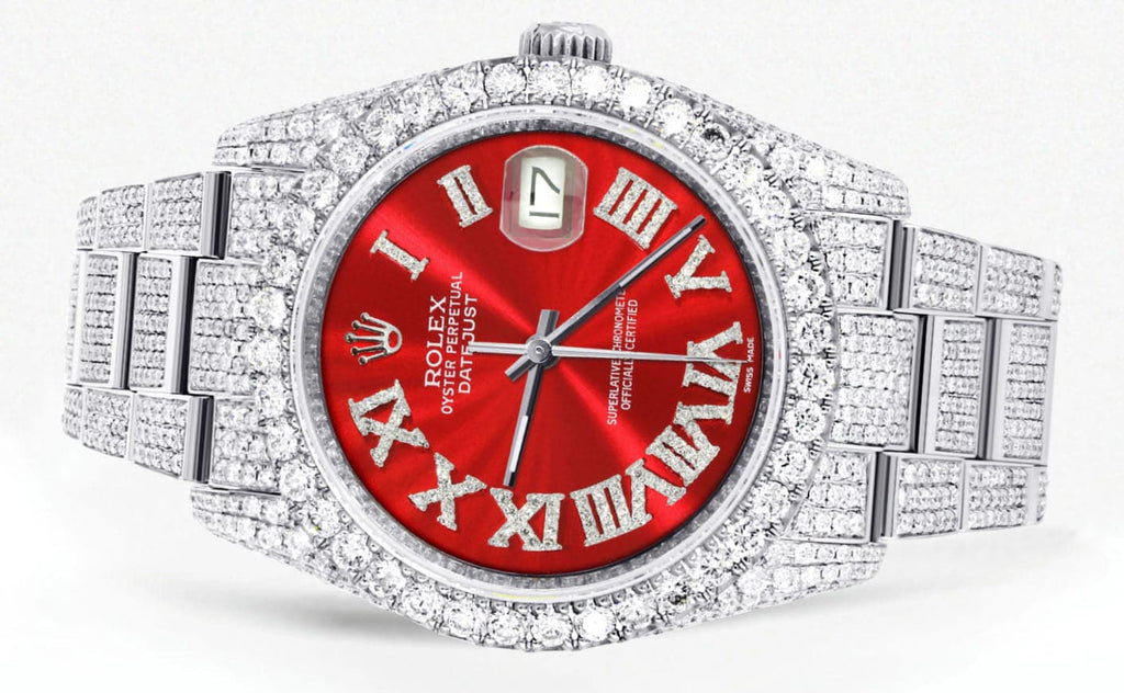 Iced Out Rolex Datejust 36 MM | Stainless Steel | 16.5 Carats of Diamonds | Red Roman Diamond Dial | Oyster Band | Model 116200