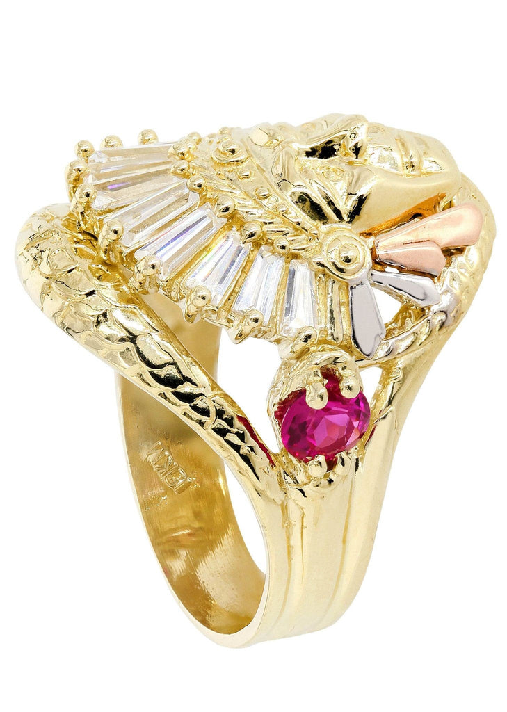 Indian and Cz 10K Yellow Gold Mens Ring. The Ring Weighs Approximately 10.9 Grams With An Average Length Of 18 Mm And Average Width Of 19 Mm