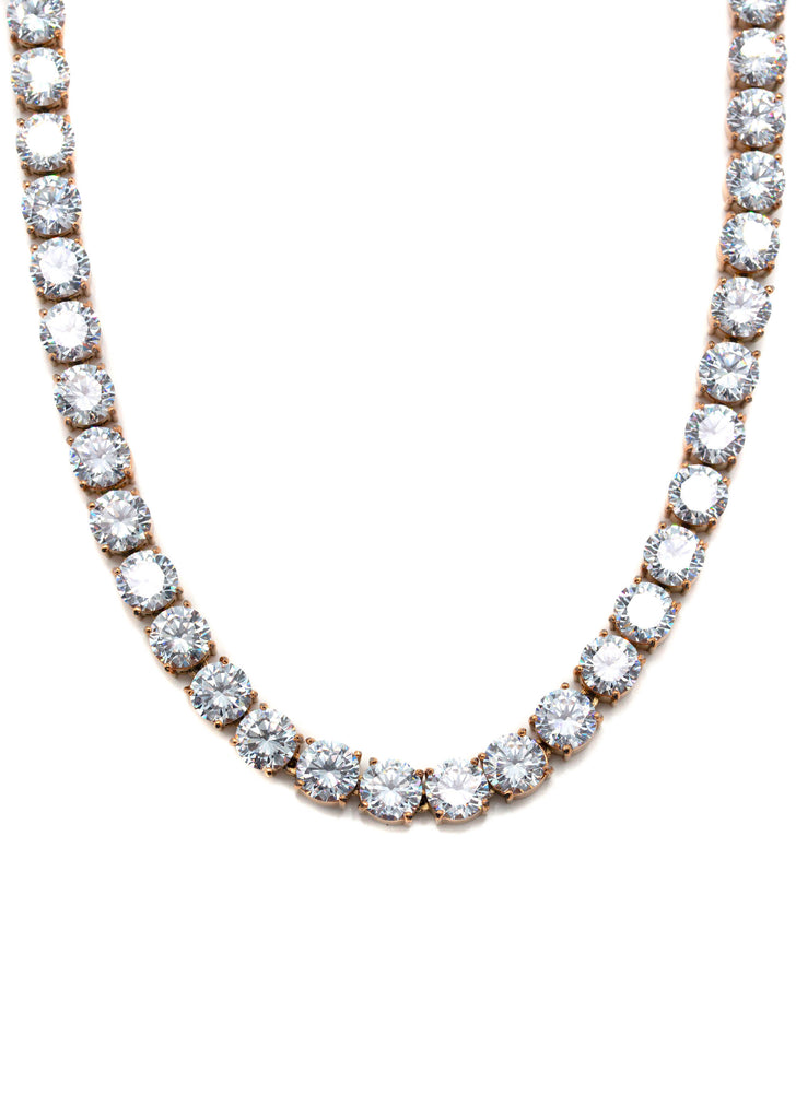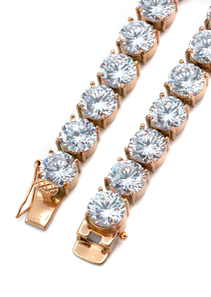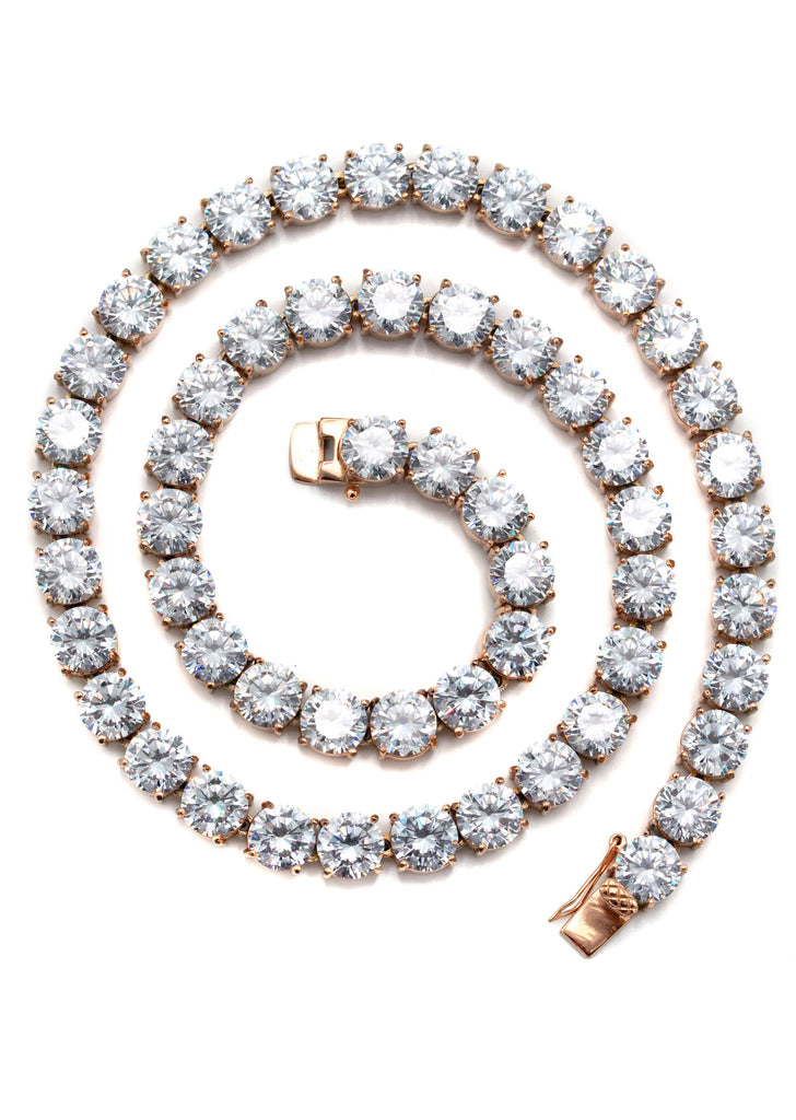 14K rose gold tennis chain with real lab grown diamonds which can be customized to any length and width. Select the length and width above and the diamond carat weight along with the gram weight will adjust. The tennis chain comes with VS clarity and F - G color diamonds.