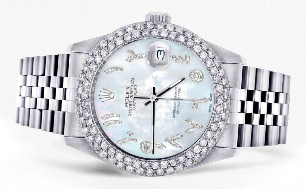 Mens Rolex Datejust Watch 16200 | 36Mm | Mother of Pearl Arabic Diamond Dial | Two Row 4.25 Carat Bezel | Jubilee Band