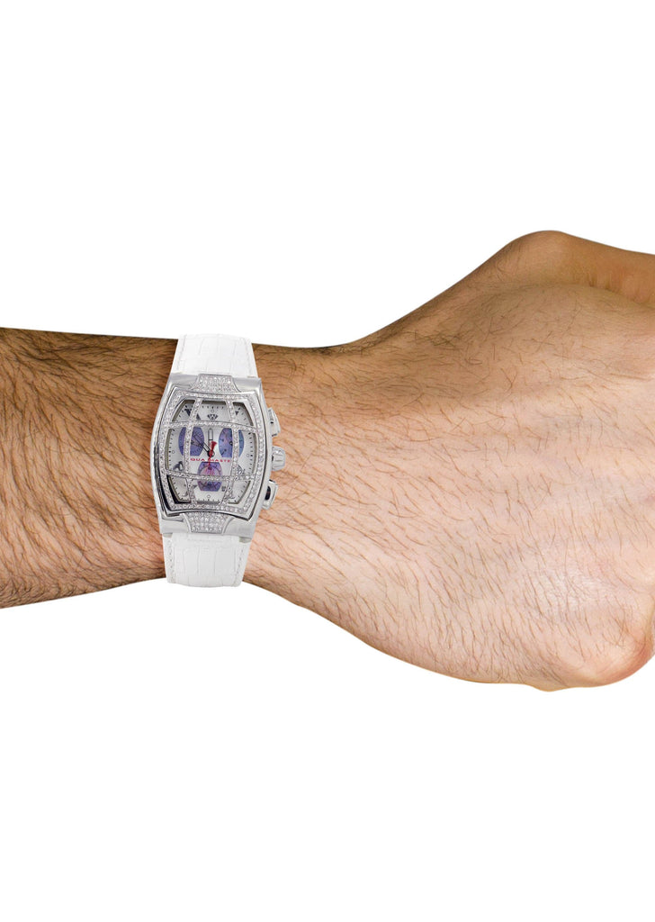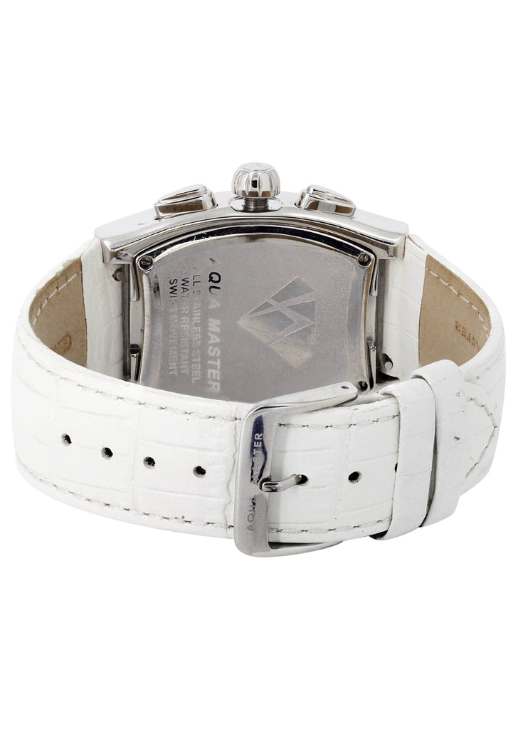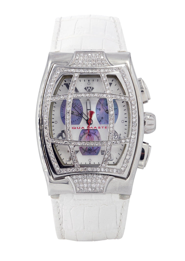 | Designer Aquamaster White Gold Tone Diamond Watch With Approximately 2 Carats Of Vs Quality Diamonds, 40MM Case. This Watch Comes With A Leather Band Which Can Be Adjusted To Any Size For Comfort. |