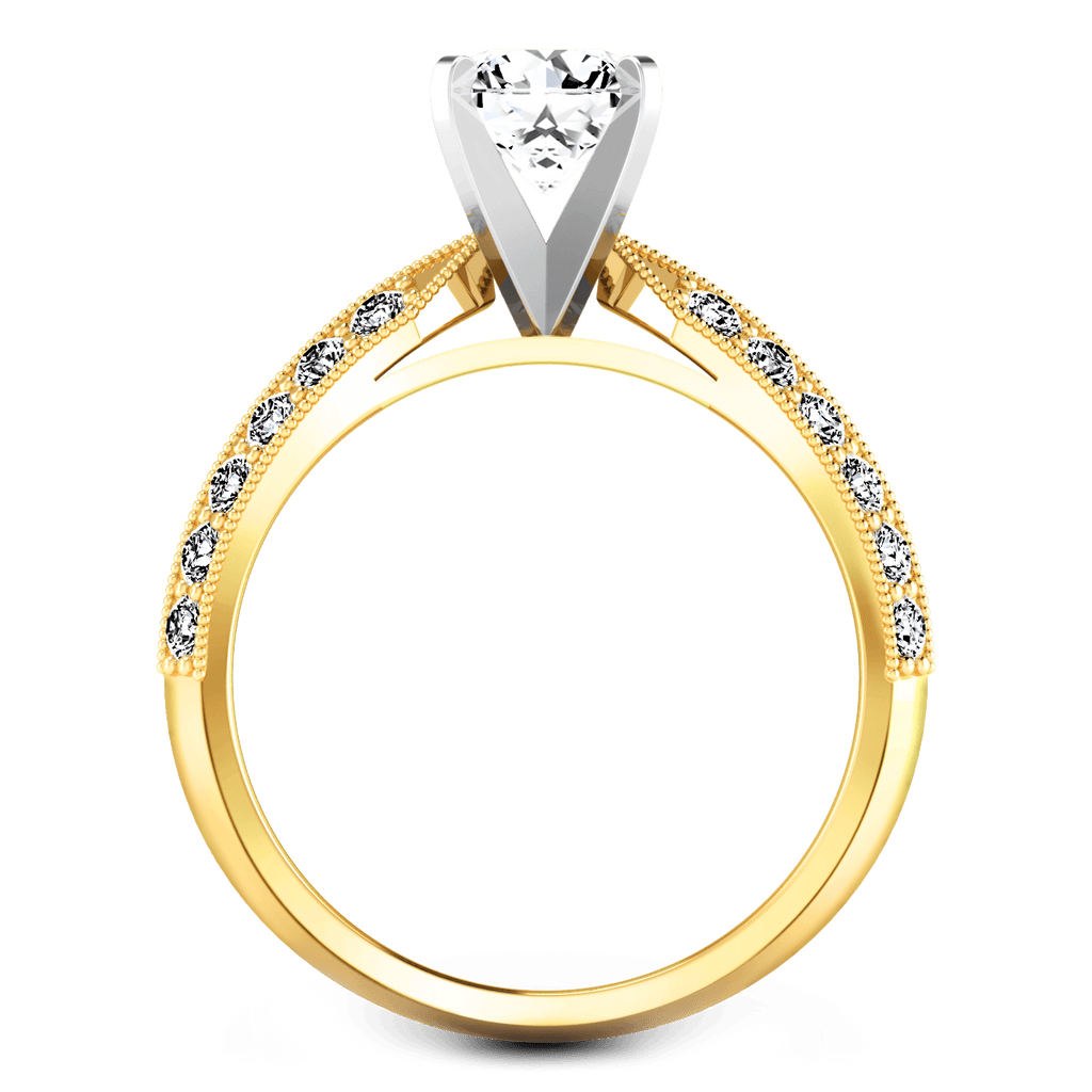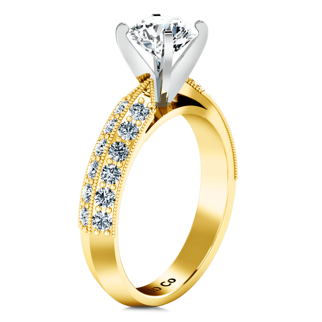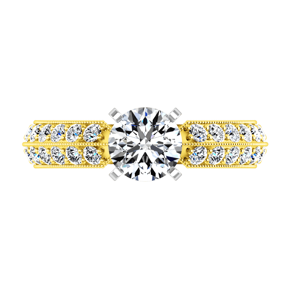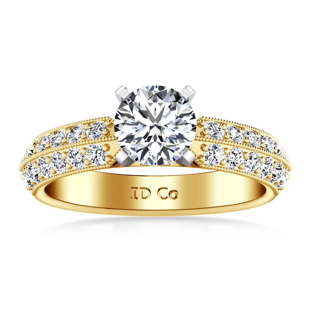 This romantic setting dazzles with a double row of diamonds and milgraining. Featured with 0.5 carats of pave diamonds in 14k yellow gold with an average width of 3mm . This ring is fully customizable, so pick your center diamond size, color and clarity and we will custom build it for you.