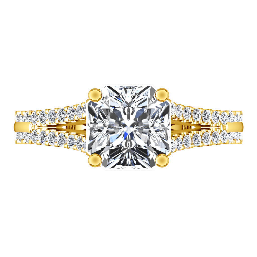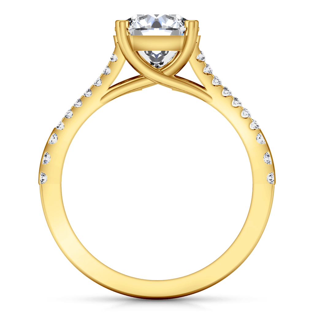 Shimmering diamond side stones and an embellished mounting will draw attention to your brilliant center diamond. Featured with 0.45 carats of pave diamonds in 14k yellow gold with an average width of 2mm . This ring is fully customizable, so pick your center diamond size, color and clarity and we will custom build it for you.
