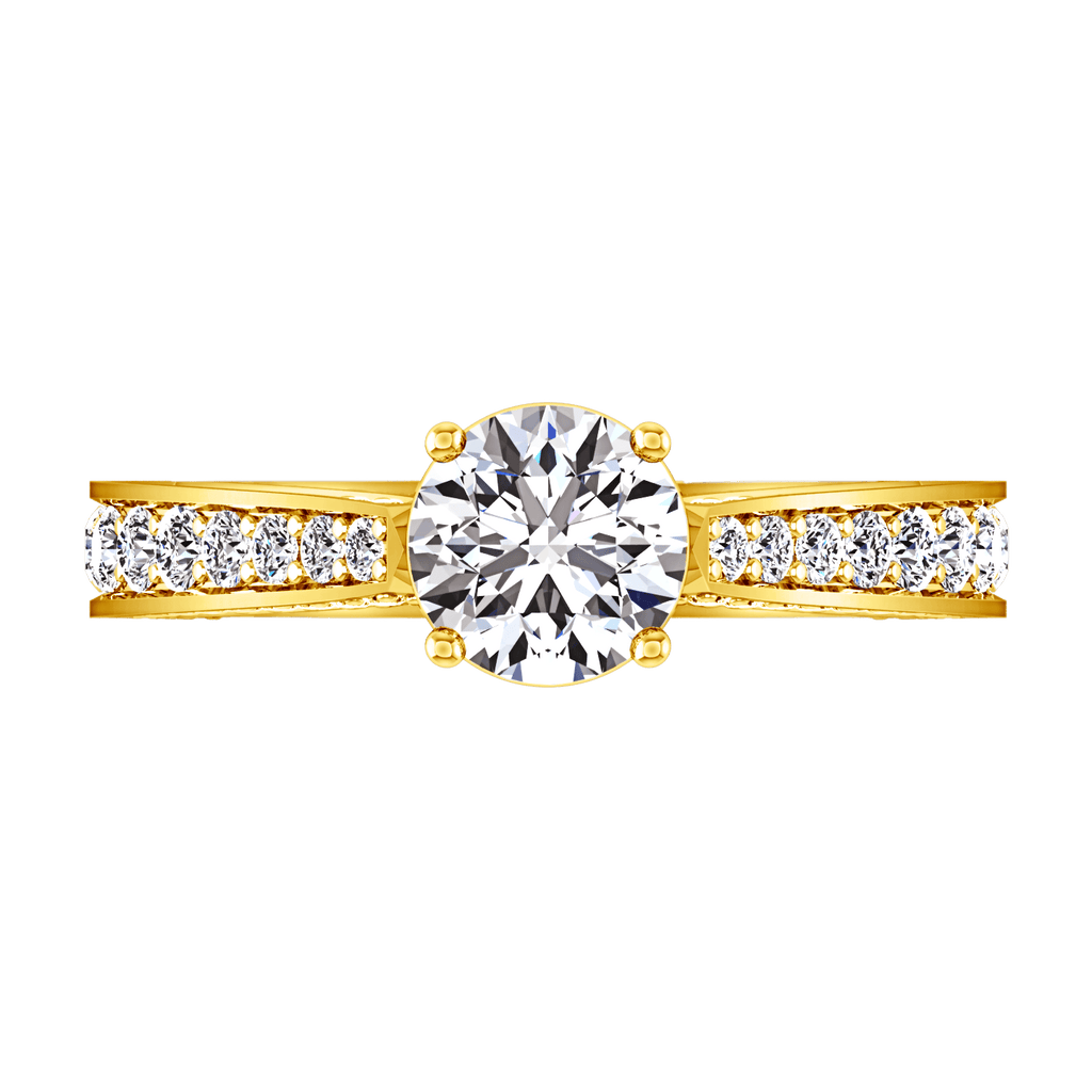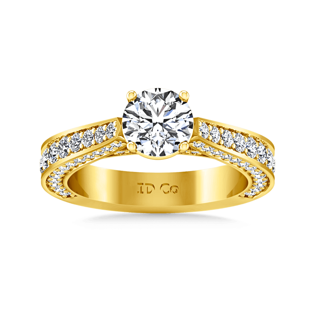 Brilliant diamonds are expertly set in this stunning and classic side stone style engagement ring. Featured with 1.25 carats of pave diamonds in 14k yellow gold with an average width of 3.5mm . This ring is fully customizable, so pick your center diamond size, color and clarity and we will custom build it for you.