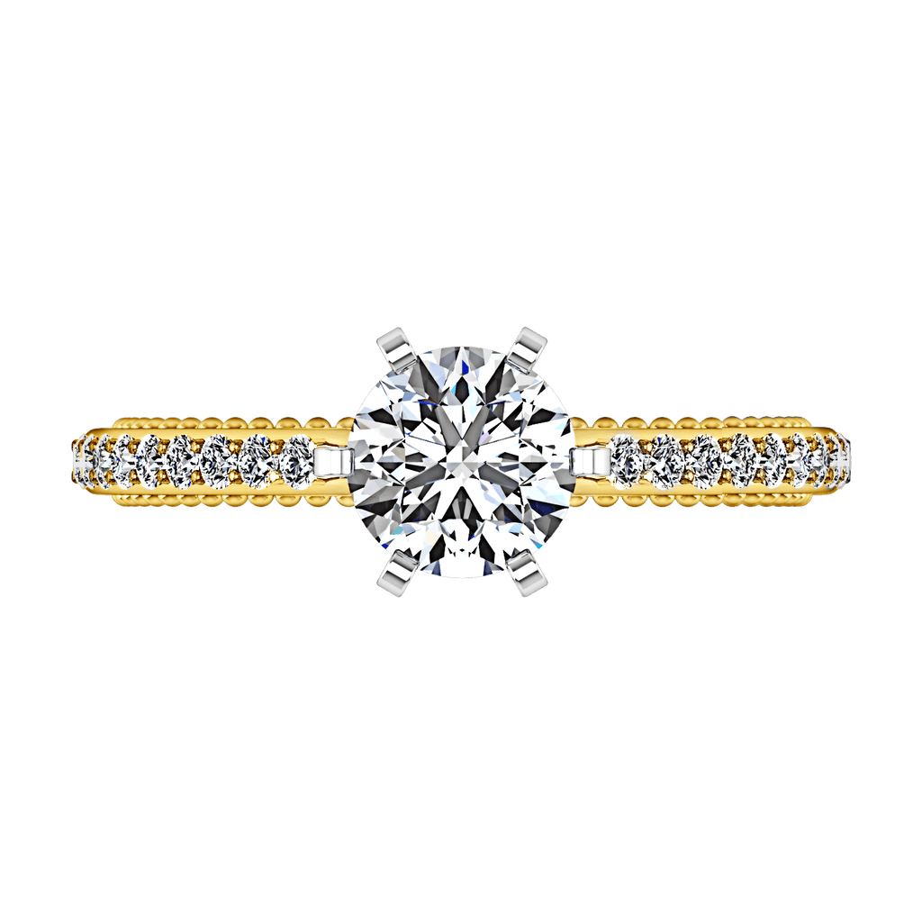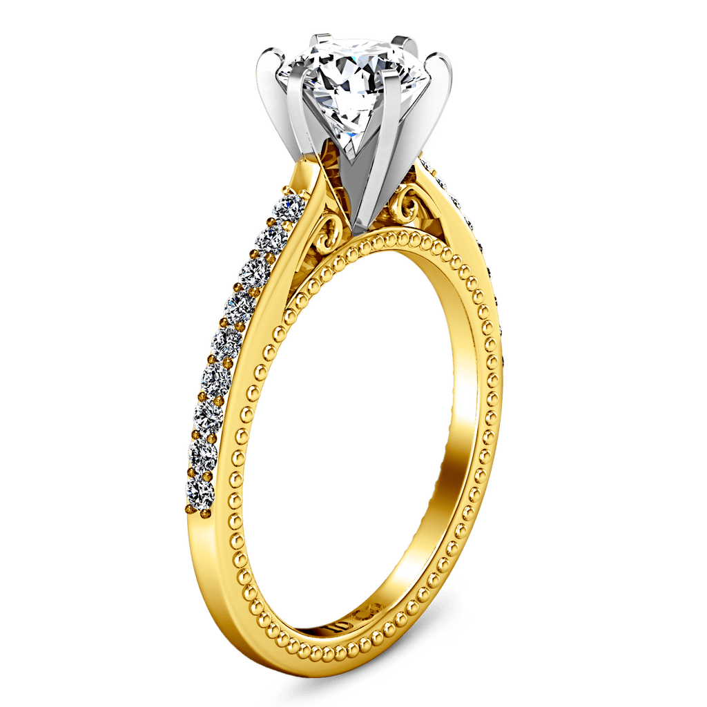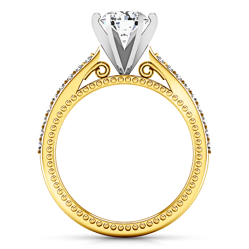 This ring is gracefully adorned with applied coil designs under the gallery of this courtly setting. Diamond accent stones are mounted along the sides as they frame your center diamond giving it a very lavish look. Featured with 0.36 carats of pave diamonds in 14k yellow gold with an average width of 2mm . This ring is fully customizable, so pick your center diamond size, color and clarity and we will custom build it for you.