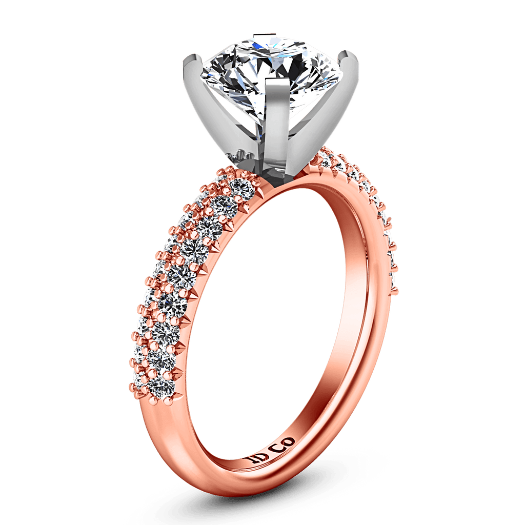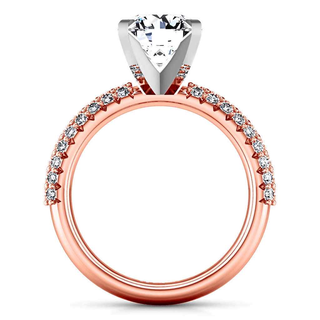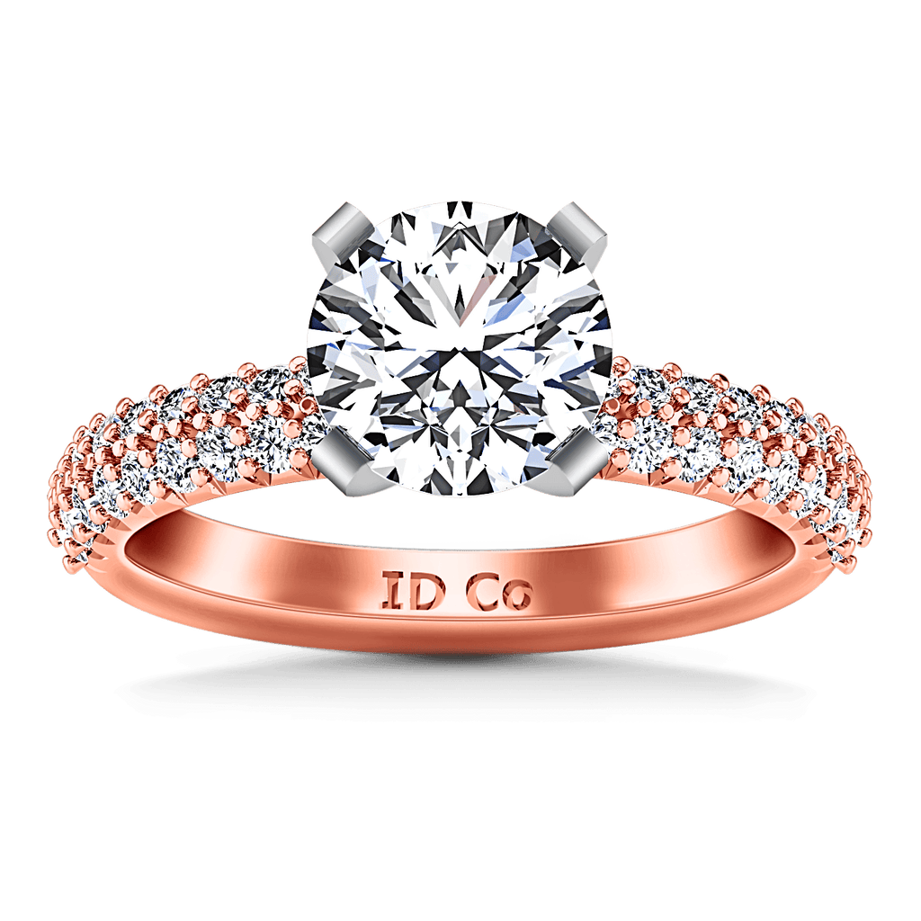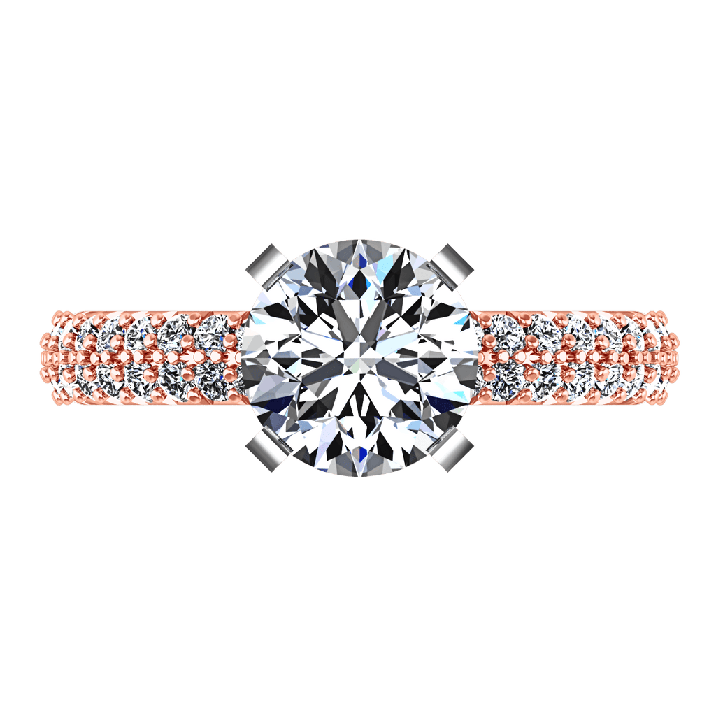Shimmering rows of pave set diamond accent stones highlight your dazzling center diamond. Featured with 0.55 carats of pave diamonds in 14k rose gold with an average width of 2.5mm . This ring is fully customizable, so pick your center diamond size, color and clarity and we will custom build it for you.